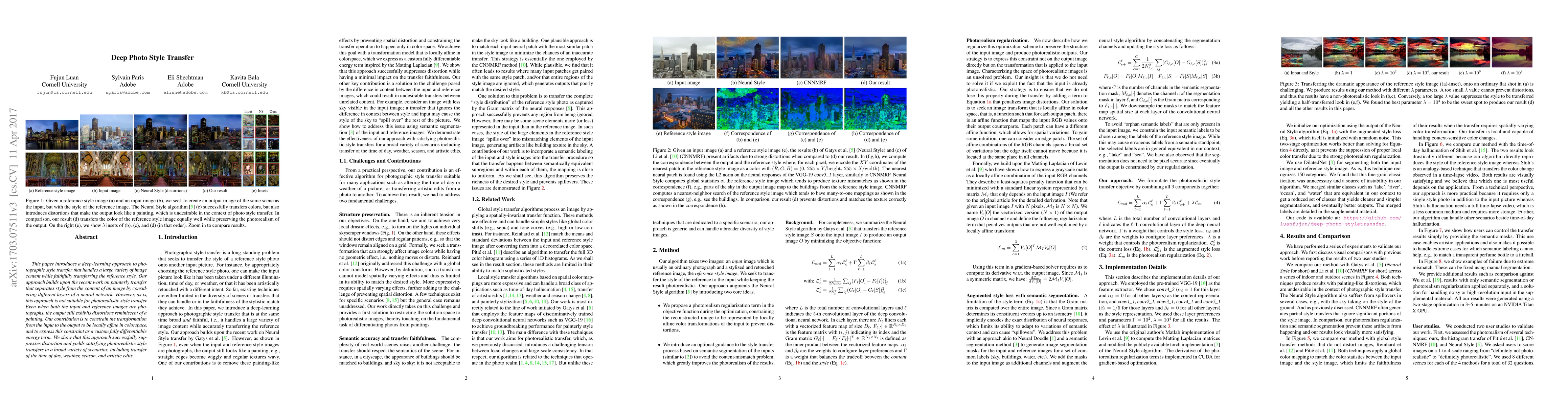 This paper proposes a deep-learning method for photorealistic style transfer by constraining the transformation to be locally affine in colorspace, addressing distortions seen in previous painterly style methods. The approach achieves realistic style transfers across various scenarios, including time of day and weather changes.