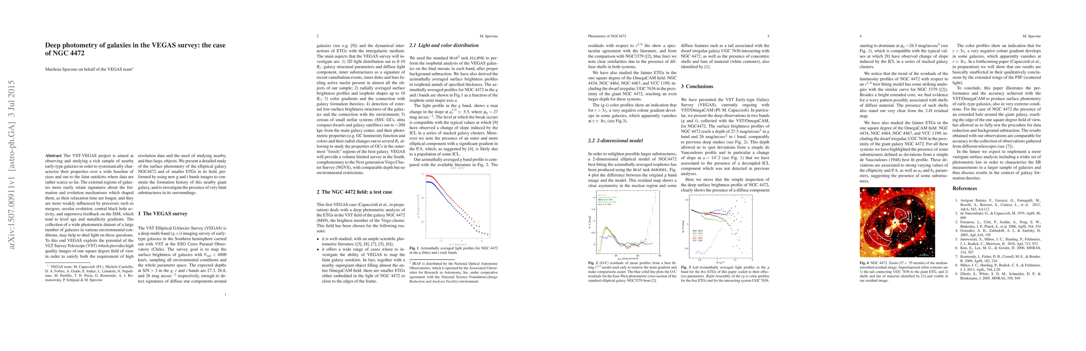 The VST-VEGAS project is aimed at observing and studying a rich sample of nearby early-type galaxies in order to systematically characterize their properties over a wide baseline of sizes and out to the faint outskirts where data are rather scarce so far. The external regions of galaxies more easily retain signatures about the formation and evolution mechanisms which shaped them, as their relaxation time are longer, and they are more weakly influenced by processes such as mergers, secular evolution, central black hole activity, and supernova feedback on the ISM, which tend to level age and metallicity gradients. The collection of a wide photometric dataset of a large number of galaxies in various environmental conditions, may help to shed light on these questions. To this end VEGAS exploits the potential of the VLT Survey Telescope (VST) which provides high quality images of one square degree field of view in order to satisfy both the requirement of high resolution data and the need of studying nearby, and thus large, objects. We present a detailed study of the surface photometry of the elliptical galaxy NGC4472 and of smaller ETGs in its field, performed by using new g and i bands images to constrain the formation history of this nearby giant galaxy, and to investigate the presence of very faint substructures in its surroundings.