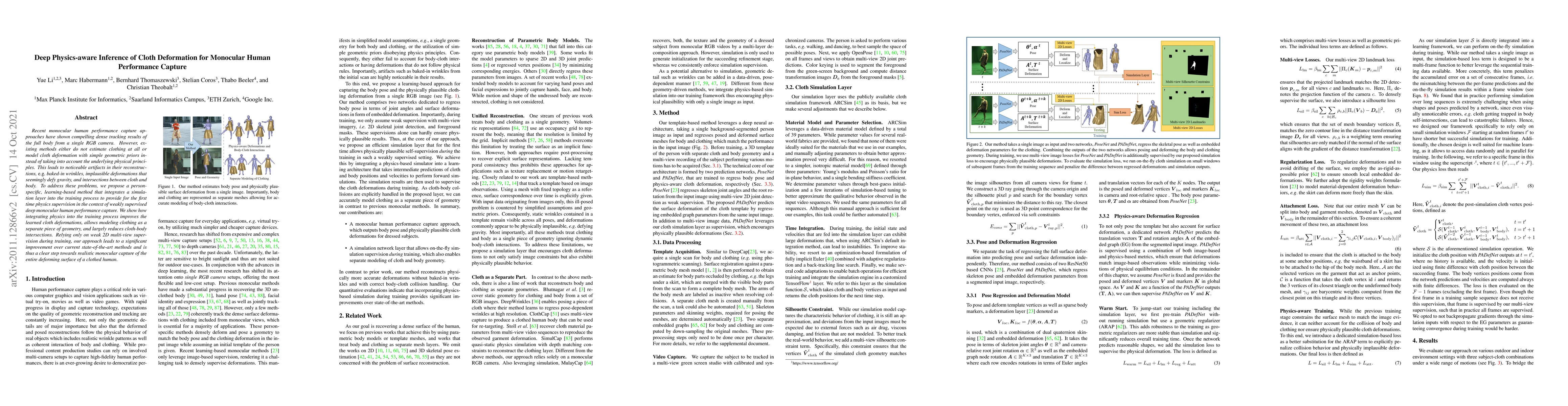 This paper proposes a novel method for monocular human performance capture that integrates physics-aware simulation during training to improve the modeling of cloth deformation, reducing artifacts like baked-in wrinkles and intersections between cloth and body. The approach achieves significant improvements over current methods using only weak 2D multi-view supervision.