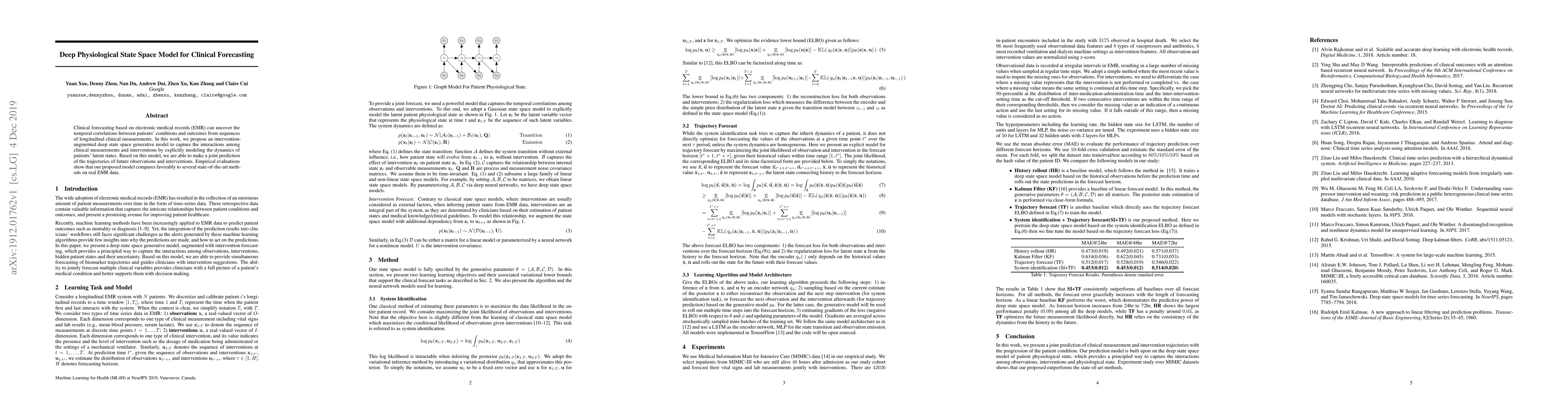 Clinical forecasting based on electronic medical records (EMR) can uncover the temporal correlations between patients' conditions and outcomes from sequences of longitudinal clinical measurements. In this work, we propose an intervention-augmented deep state space generative model to capture the interactions among clinical measurements and interventions by explicitly modeling the dynamics of patients' latent states. Based on this model, we are able to make a joint prediction of the trajectories of future observations and interventions. Empirical evaluations show that our proposed model compares favorably to several state-of-the-art methods on real EMR data.