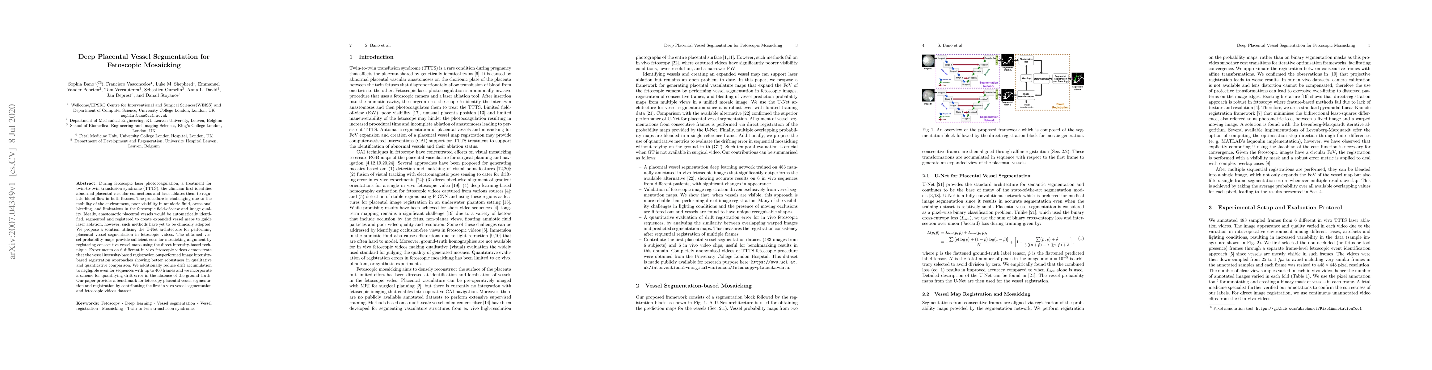 During fetoscopic laser photocoagulation, a treatment for twin-to-twin transfusion syndrome (TTTS), the clinician first identifies abnormal placental vascular connections and laser ablates them to regulate blood flow in both fetuses. The procedure is challenging due to the mobility of the environment, poor visibility in amniotic fluid, occasional bleeding, and limitations in the fetoscopic field-of-view and image quality. Ideally, anastomotic placental vessels would be automatically identified, segmented and registered to create expanded vessel maps to guide laser ablation, however, such methods have yet to be clinically adopted. We propose a solution utilising the U-Net architecture for performing placental vessel segmentation in fetoscopic videos. The obtained vessel probability maps provide sufficient cues for mosaicking alignment by registering consecutive vessel maps using the direct intensity-based technique. Experiments on 6 different in vivo fetoscopic videos demonstrate that the vessel intensity-based registration outperformed image intensity-based registration approaches showing better robustness in qualitative and quantitative comparison. We additionally reduce drift accumulation to negligible even for sequences with up to 400 frames and we incorporate a scheme for quantifying drift error in the absence of the ground-truth. Our paper provides a benchmark for fetoscopy placental vessel segmentation and registration by contributing the first in vivo vessel segmentation and fetoscopic videos dataset.