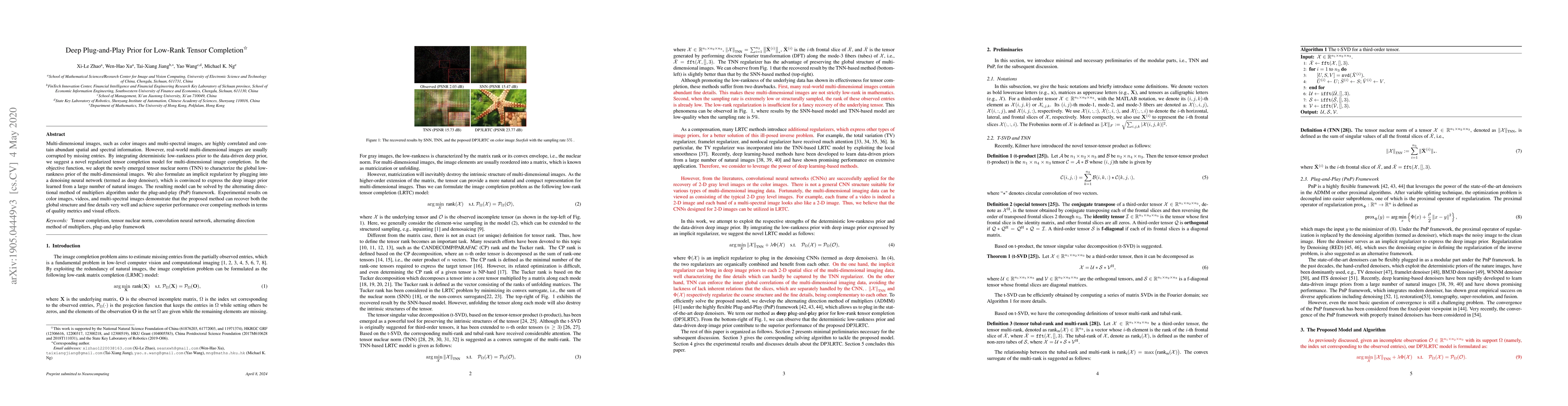 Multi-dimensional images, such as color images and multi-spectral images, are highly correlated and contain abundant spatial and spectral information. However, real-world multi-dimensional images are usually corrupted by missing entries. By integrating deterministic low-rankness prior to the data-driven deep prior, we suggest a novel regularized tensor completion model for multi-dimensional image completion. In the objective function, we adopt the newly emerged tensor nuclear norm (TNN) to characterize the global low-rankness prior of the multi-dimensional images. We also formulate an implicit regularizer by plugging into a denoising neural network (termed as deep denoiser), which is convinced to express the deep image prior learned from a large number of natural images. The resulting model can be solved by the alternating directional method of multipliers algorithm under the plug-and-play (PnP) framework. Experimental results on color images, videos, and multi-spectral images demonstrate that the proposed method can recover both the global structure and fine details very well and achieve superior performance over competing methods in terms of quality metrics and visual effects.