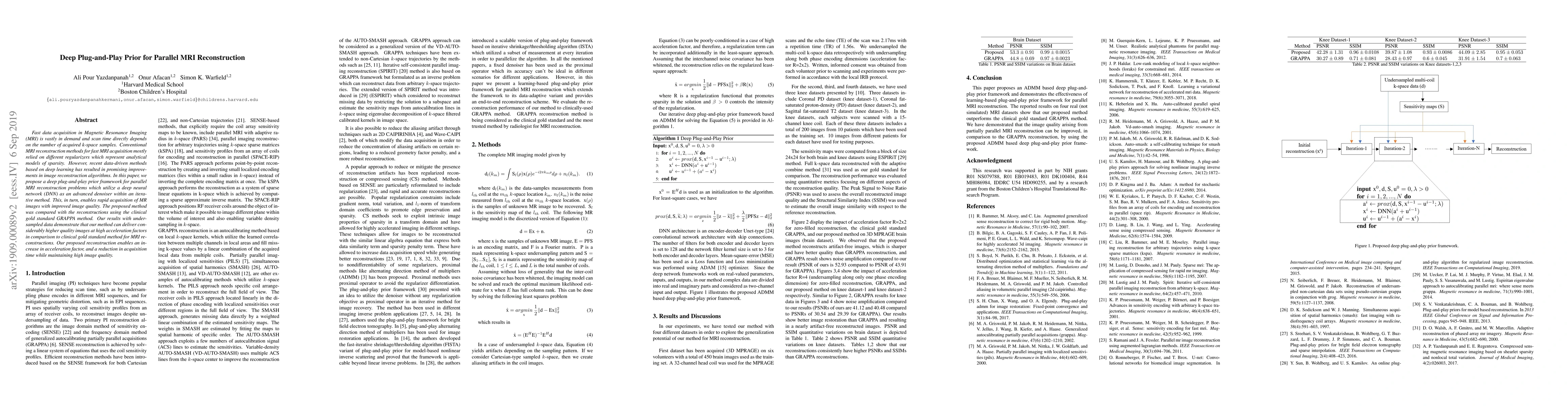 This paper proposes a deep plug-and-play prior framework for parallel MRI reconstruction using a deep neural network as a denoiser, achieving higher quality images at high acceleration factors compared to the clinical gold standard GRAPPA method. The method enables faster MR image acquisition with maintained high image quality.