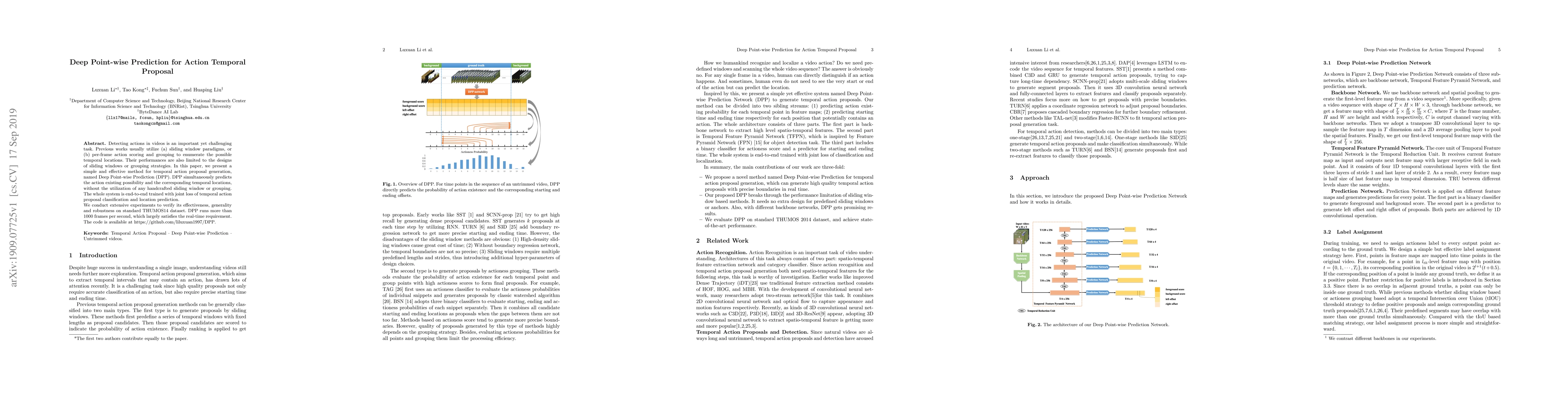 A new method called Deep Point-wise Prediction (DPP) improves action detection in videos by predicting both action existence and temporal locations simultaneously without using sliding windows or grouping strategies. DPP achieves real-time performance and is verified effective on the THUMOS14 dataset.