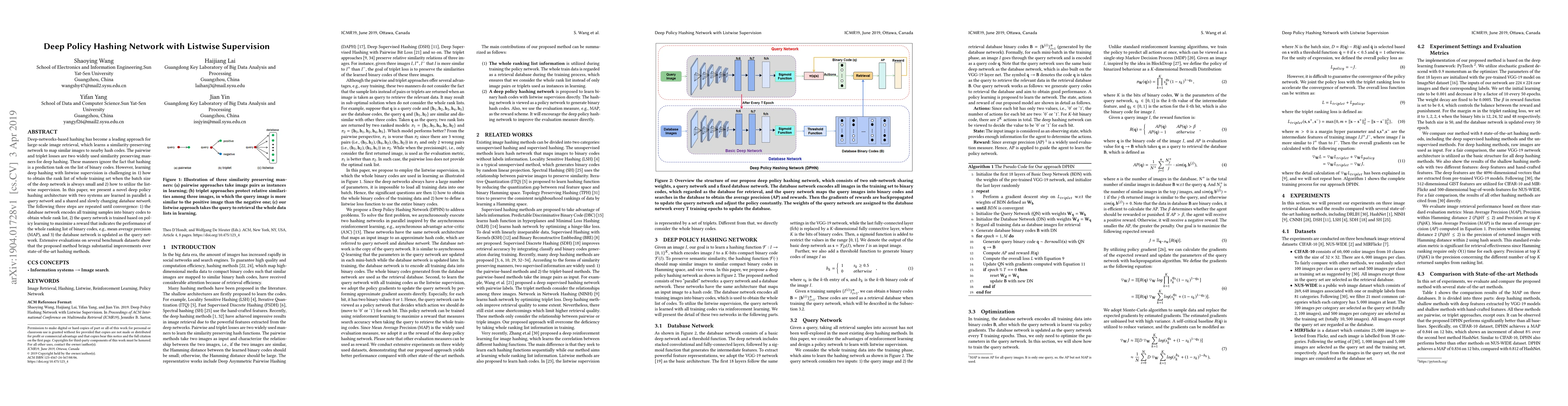 This paper introduces a Deep Policy Hashing Network with listwise supervision to improve large-scale image retrieval. It employs a dual-network architecture to learn a query network and a database network, optimizing listwise ranking metrics like mean average precision through policy learning.