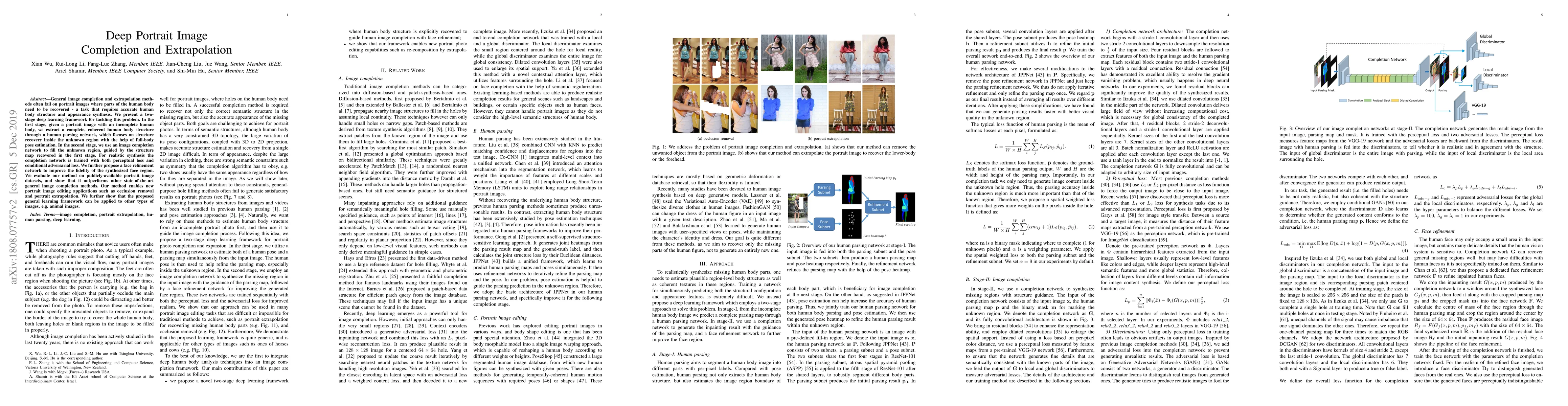 General image completion and extrapolation methods often fail on portrait images where parts of the human body need to be recovered - a task that requires accurate human body structure and appearance synthesis. We present a two-stage deep learning framework for tacking this problem. In the first stage, given a portrait image with an incomplete human body, we extract a complete, coherent human body structure through a human parsing network, which focuses on structure recovery inside the unknown region with the help of pose estimation. In the second stage, we use an image completion network to fill the unknown region, guided by the structure map recovered in the first stage. For realistic synthesis the completion network is trained with both perceptual loss and conditional adversarial loss. We evaluate our method on public portrait image datasets, and show that it outperforms other state-of-art general image completion methods. Our method enables new portrait image editing applications such as occlusion removal and portrait extrapolation. We further show that the proposed general learning framework can be applied to other types of images, e.g. animal images.