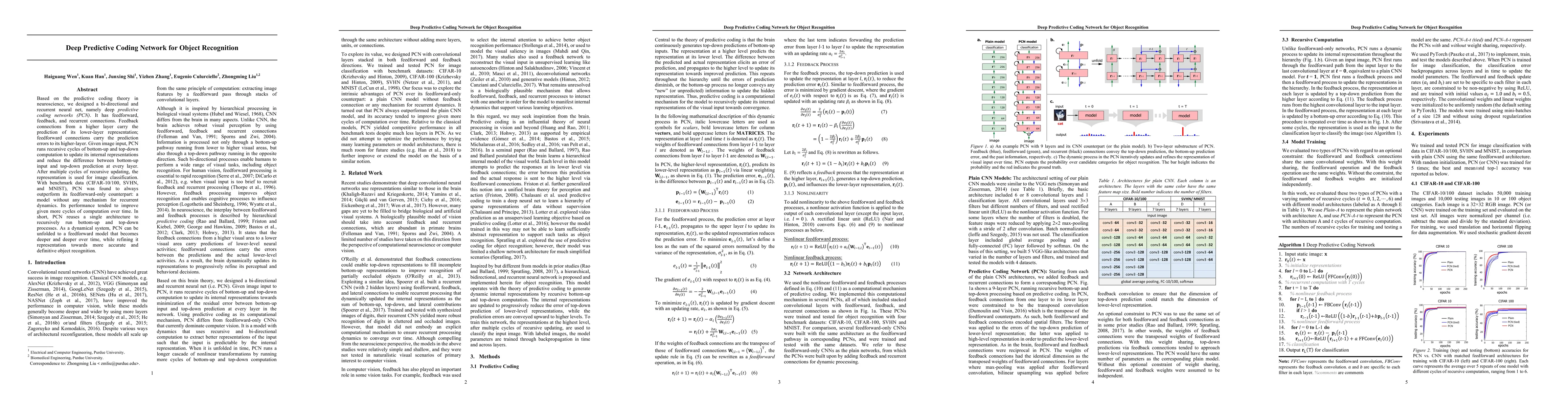 The paper proposes a deep predictive coding network (PCN) based on neuroscience's predictive coding theory, which uses recursive bottom-up and top-down computations to refine image representations for object recognition. PCN outperforms feedforward models on benchmark datasets, demonstrating improved performance with more cycles of computation.