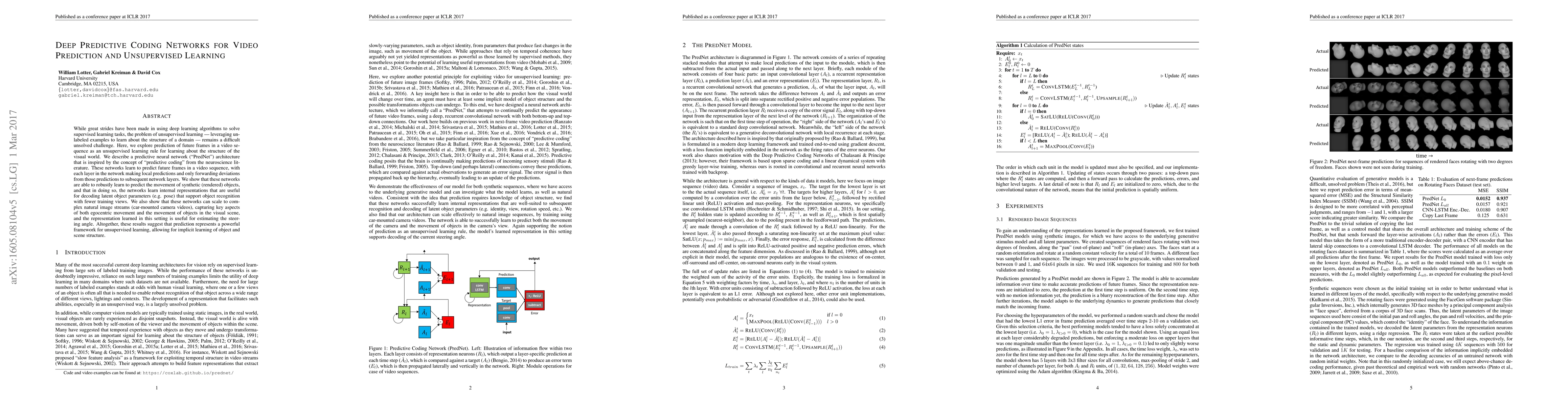 PredNet, a novel neural network architecture inspired by predictive coding principles, enabling unsupervised learning through video prediction and demonstrating effective learning of latent object parameters.