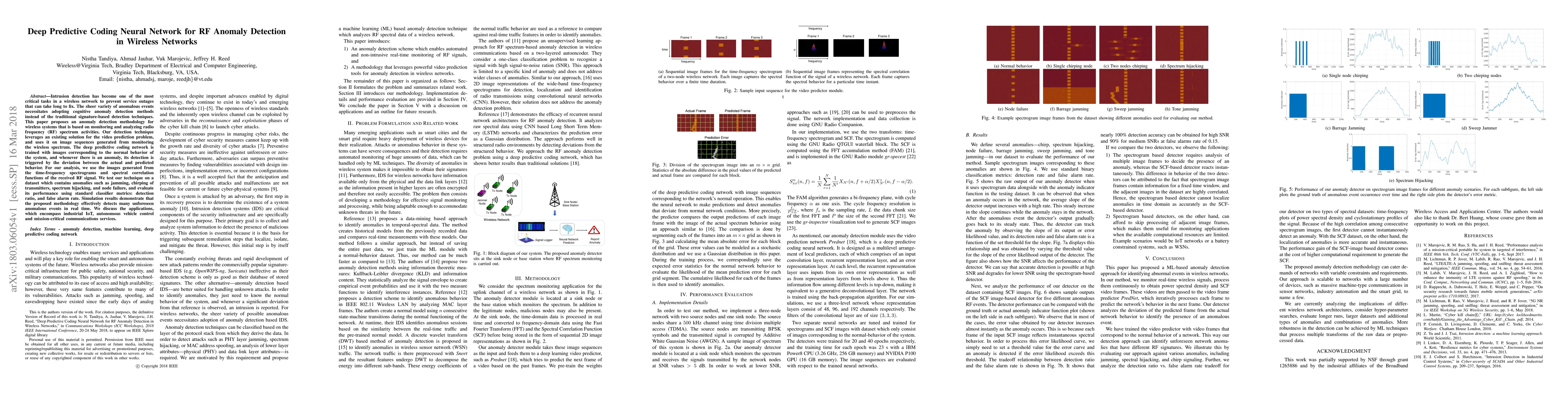 This paper proposes a deep predictive coding neural network for detecting RF anomalies in wireless networks by analyzing RF spectrum activities. The method trains on normal RF behavior and detects anomalies via deviations in predicted vs. actual behavior, showing effective real-time detection of events like jamming and spectrum hijacking.
