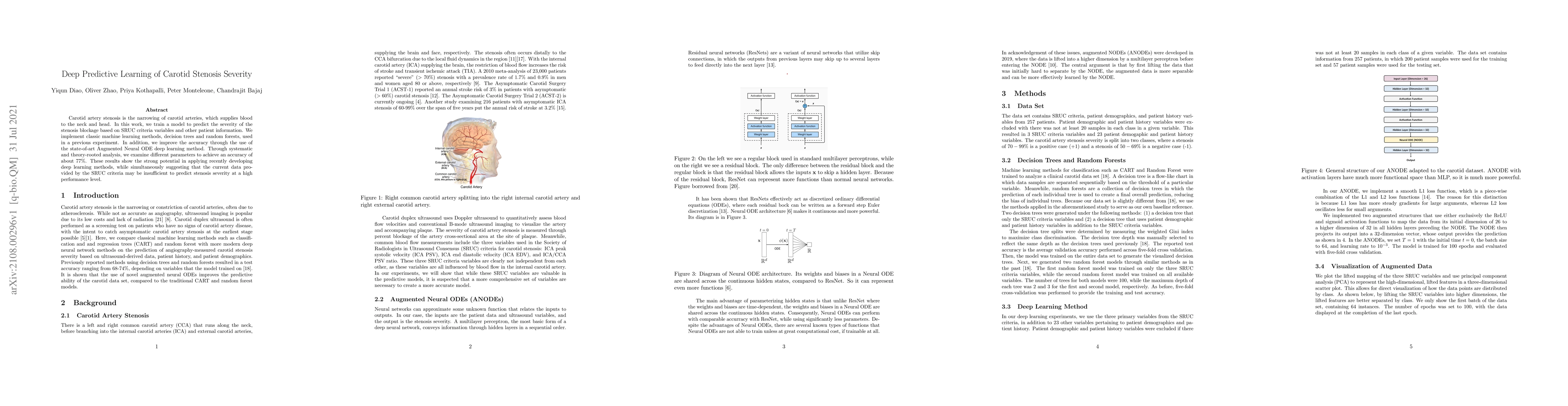 Carotid artery stenosis is the narrowing of carotid arteries, which supplies blood to the neck and head. In this work, we train a model to predict the severity of the stenosis blockage based on SRUC criteria variables and other patient information. We implement classic machine learning methods, decision trees and random forests, used in a previous experiment. In addition, we improve the accuracy through the use of the state-of-art Augmented Neural ODE deep learning method. Through systematic and theory-rooted analysis, we examine different parameters to achieve an accuracy of about 77%. These results show the strong potential in applying recently developing deep learning methods, while simultaneously suggesting that the current data provided by the SRUC criteria may be insufficient to predict stenosis severity at a high performance level.