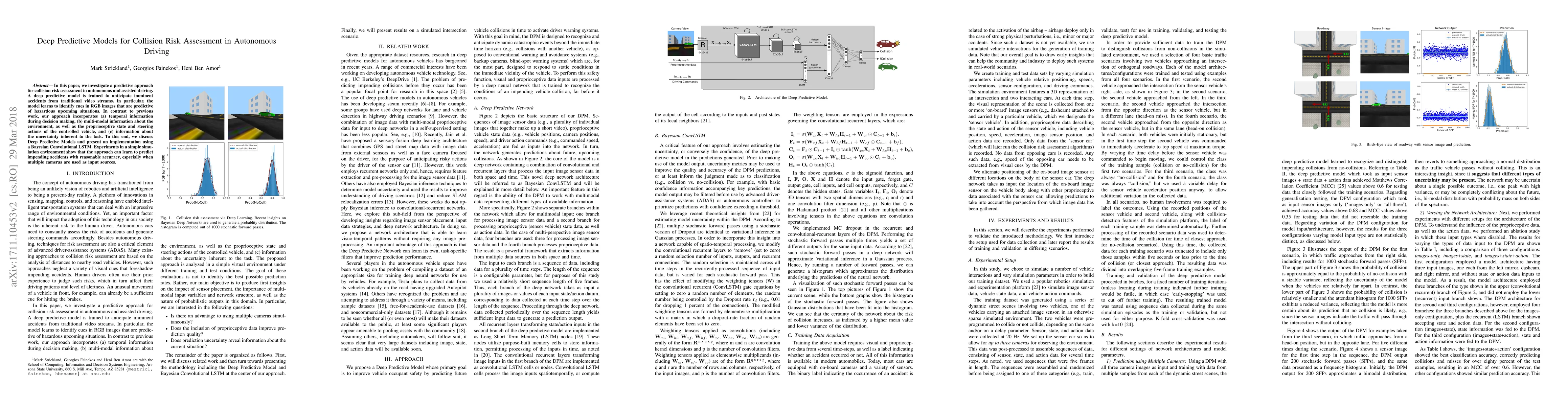 In this paper, we investigate a predictive approach for collision risk assessment in autonomous and assisted driving. A deep predictive model is trained to anticipate imminent accidents from traditional video streams. In particular, the model learns to identify cues in RGB images that are predictive of hazardous upcoming situations. In contrast to previous work, our approach incorporates (a) temporal information during decision making, (b) multi-modal information about the environment, as well as the proprioceptive state and steering actions of the controlled vehicle, and (c) information about the uncertainty inherent to the task. To this end, we discuss Deep Predictive Models and present an implementation using a Bayesian Convolutional LSTM. Experiments in a simple simulation environment show that the approach can learn to predict impending accidents with reasonable accuracy, especially when multiple cameras are used as input sources.