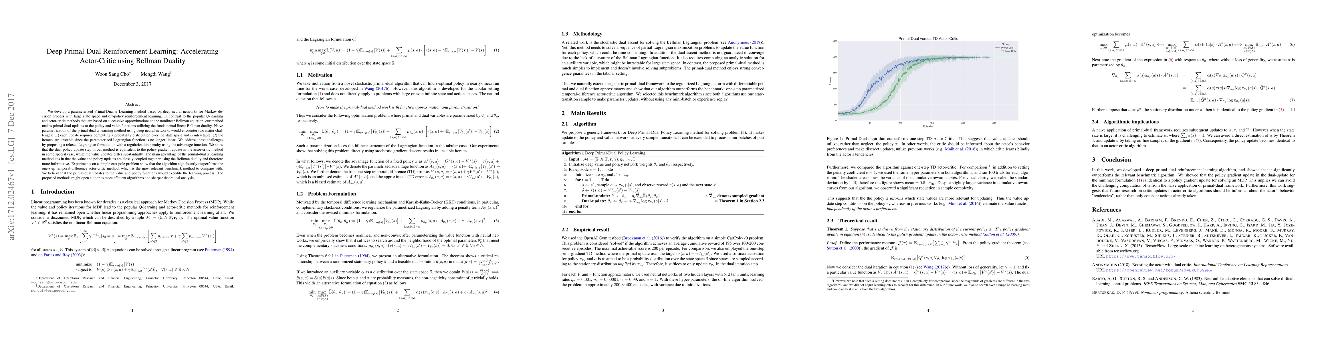 This paper introduces a deep primal-dual reinforcement learning method for large state space Markov decision processes, addressing challenges of intractability and instability in updates. The proposed method leverages Bellman duality for coupled value and policy updates, showing improved performance over actor-critic methods in experiments.