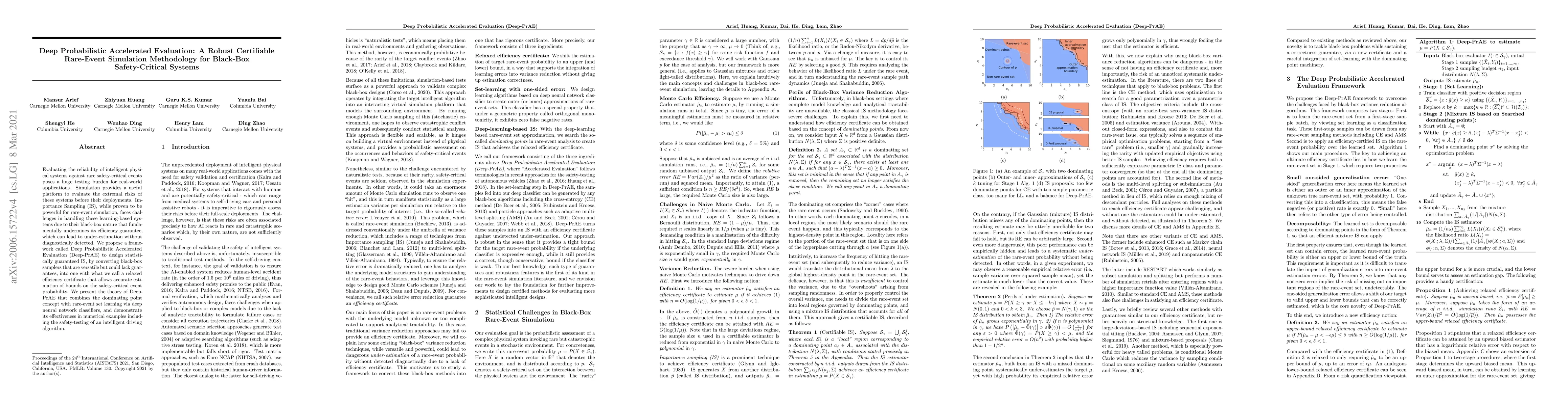 The paper introduces Deep Probabilistic Accelerated Evaluation (Deep-PrAE), a robust methodology for rare-event simulation in black-box safety-critical systems, addressing the inefficiencies of traditional Importance Sampling. It combines deep learning with probabilistic techniques to provide statistically guaranteed estimates of extremal risks.