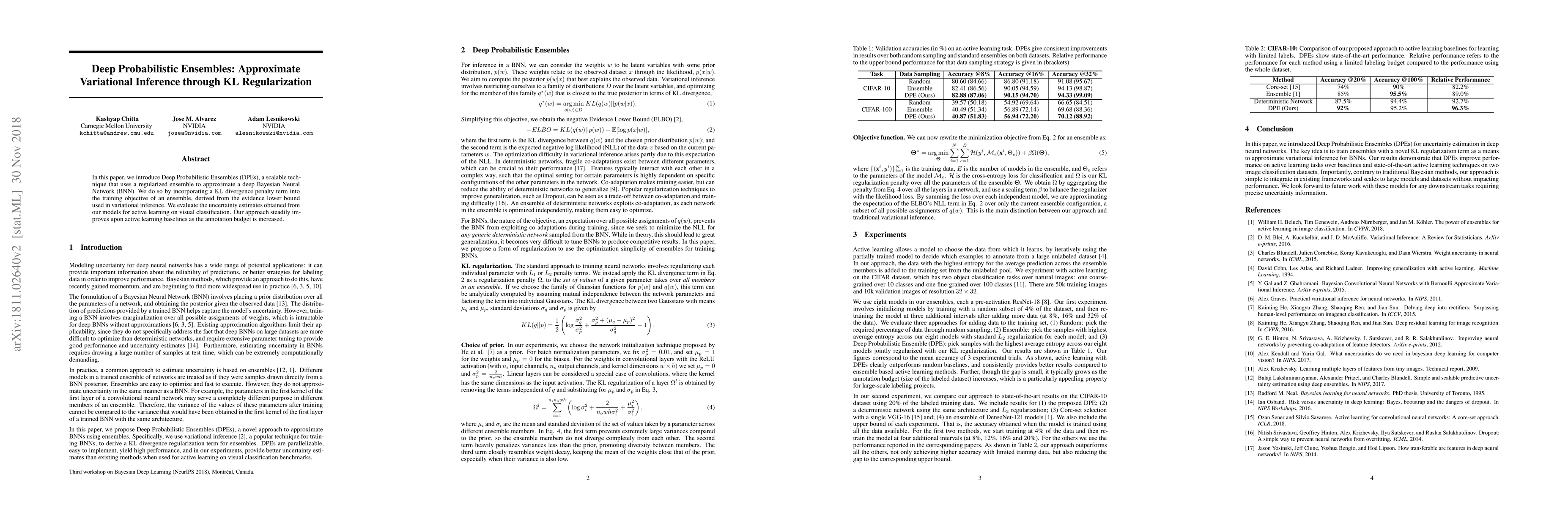 This paper presents Deep Probabilistic Ensembles (DPEs), a scalable method for approximating deep Bayesian Neural Networks via a KL divergence regularized ensemble. The technique shows improved performance in active learning for visual classification tasks as annotation budgets grow.