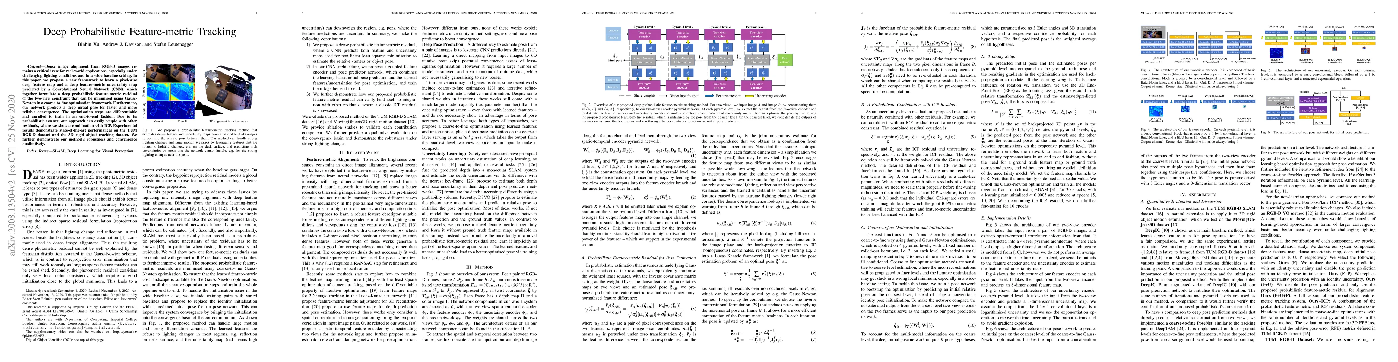 Researchers propose a new framework for dense image alignment from RGB-D images using deep probabilistic feature-metric tracking, achieving state-of-the-art performances on challenging lighting conditions and wide baselines.