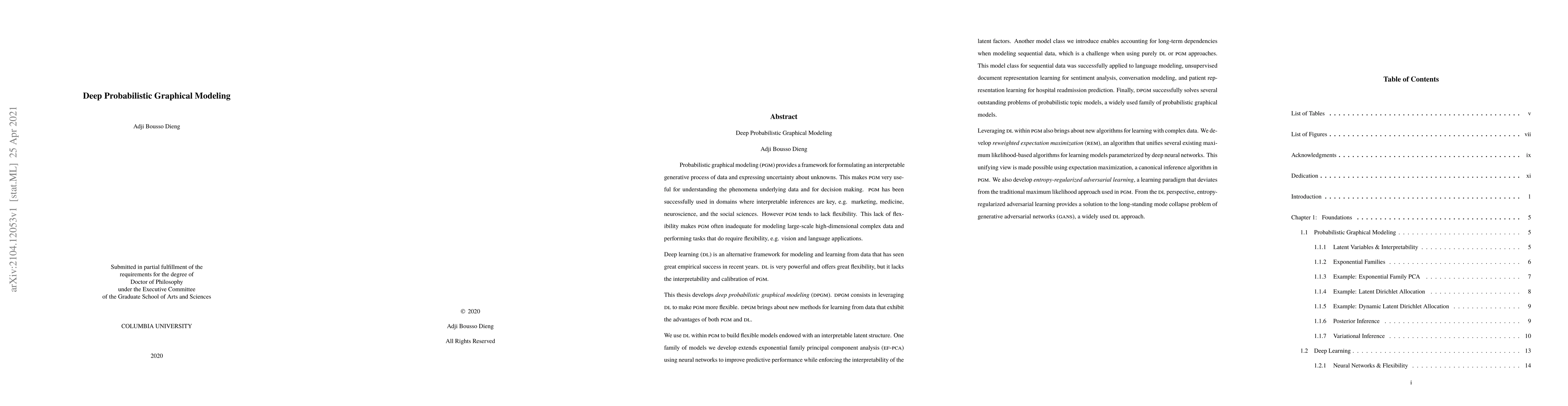Probabilistic graphical modeling (PGM) provides a framework for formulating an interpretable generative process of data and expressing uncertainty about unknowns, but it lacks flexibility. Deep learning (DL) is an alternative framework for learning from data that has achieved great empirical success in recent years. DL offers great flexibility, but it lacks the interpretability and calibration of PGM. This thesis develops deep probabilistic graphical modeling (DPGM.) DPGM consists in leveraging DL to make PGM more flexible. DPGM brings about new methods for learning from data that exhibit the advantages of both PGM and DL. We use DL within PGM to build flexible models endowed with an interpretable latent structure. One model class we develop extends exponential family PCA using neural networks to improve predictive performance while enforcing the interpretability of the latent factors. Another model class we introduce enables accounting for long-term dependencies when modeling sequential data, which is a challenge when using purely DL or PGM approaches. Finally, DPGM successfully solves several outstanding problems of probabilistic topic models, a widely used family of models in PGM. DPGM also brings about new algorithms for learning with complex data. We develop reweighted expectation maximization, an algorithm that unifies several existing maximum likelihood-based algorithms for learning models parameterized by neural networks. This unifying view is made possible using expectation maximization, a canonical inference algorithm in PGM. We also develop entropy-regularized adversarial learning, a learning paradigm that deviates from the traditional maximum likelihood approach used in PGM. From the DL perspective, entropy-regularized adversarial learning provides a solution to the long-standing mode collapse problem of generative adversarial networks, a widely used DL approach.