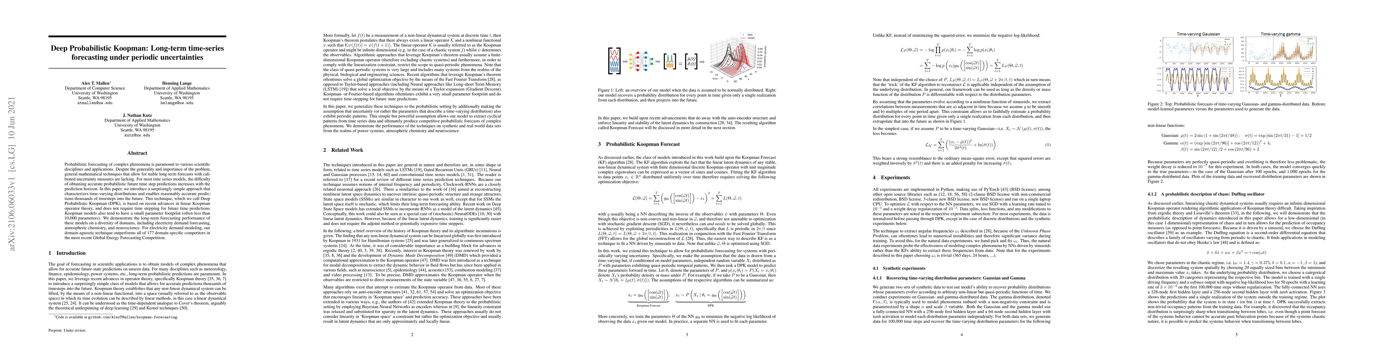 This paper introduces Deep Probabilistic Koopman (DPK), a novel method for long-term probabilistic forecasting of complex time-series data under periodic uncertainties, leveraging linear Koopman operator theory for stable predictions without time stepping. DPK demonstrates superior forecasting performance across diverse domains, outperforming 177 domain-specific competitors in the Global Energy Forecasting Competition.