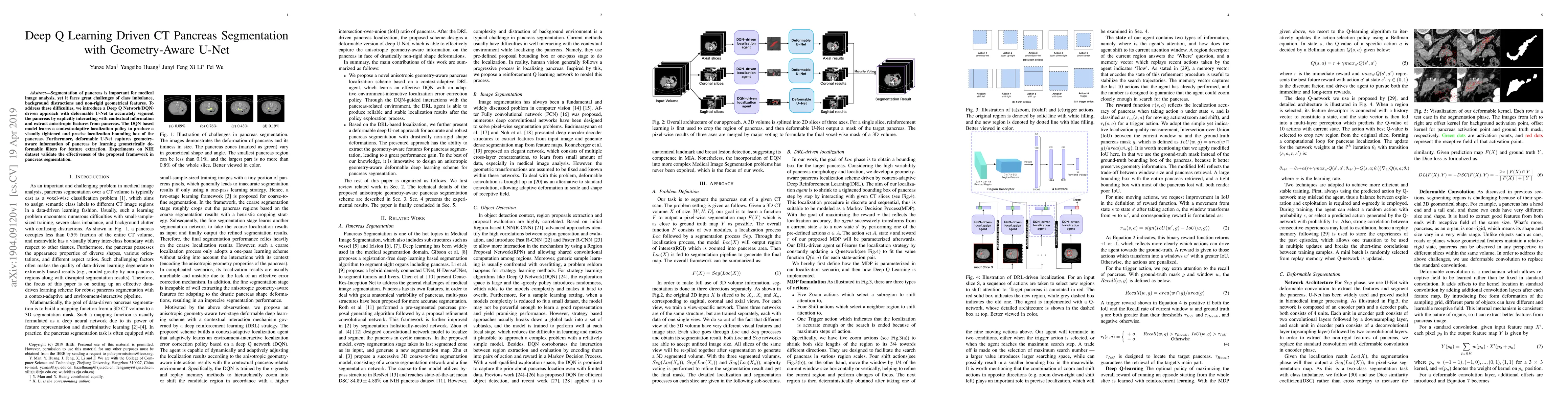 This paper proposes a Deep Q Network (DQN) driven deformable U-Net for CT pancreas segmentation, addressing class imbalance and geometrical complexities. The DQN learns a context-adaptive localization policy, while the deformable U-Net captures geometry-aware features, validated effectively on the NIH dataset.