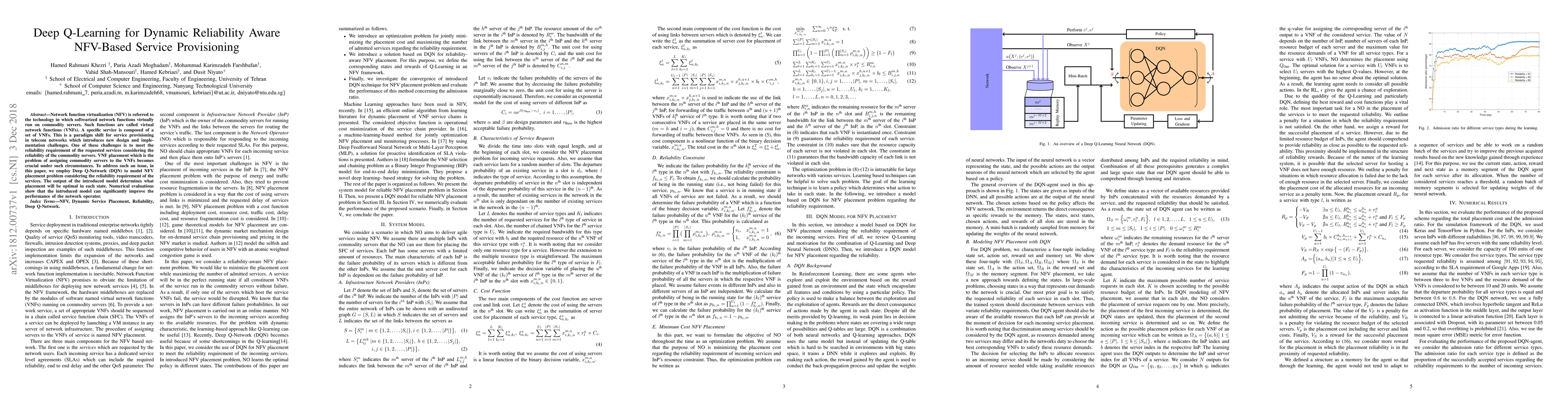 This paper proposes a Deep Q-Network (DQN) approach to optimize the placement of virtual network functions (VNFs) in NFV-based service provisioning, focusing on dynamic reliability requirements. The model significantly enhances network operator performance by determining optimal VNF placements.