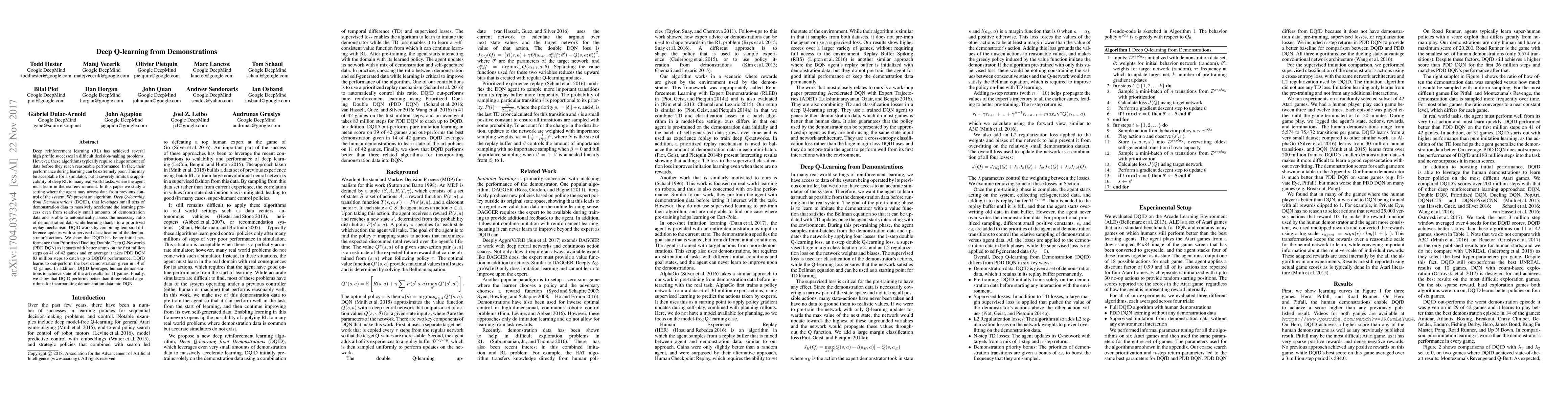 This paper introduces Deep Q-learning from Demonstrations (DQfD), an algorithm that uses small sets of human demonstration data to significantly speed up learning in deep reinforcement learning tasks. DQfD outperforms traditional methods, showing better initial performance and faster learning, even surpassing human demonstrators in 14 out of 42 games. It combines temporal difference updates with supervised learning of demonstrator actions, and it outperforms related algorithms incorporating demonstration data into DQN.
