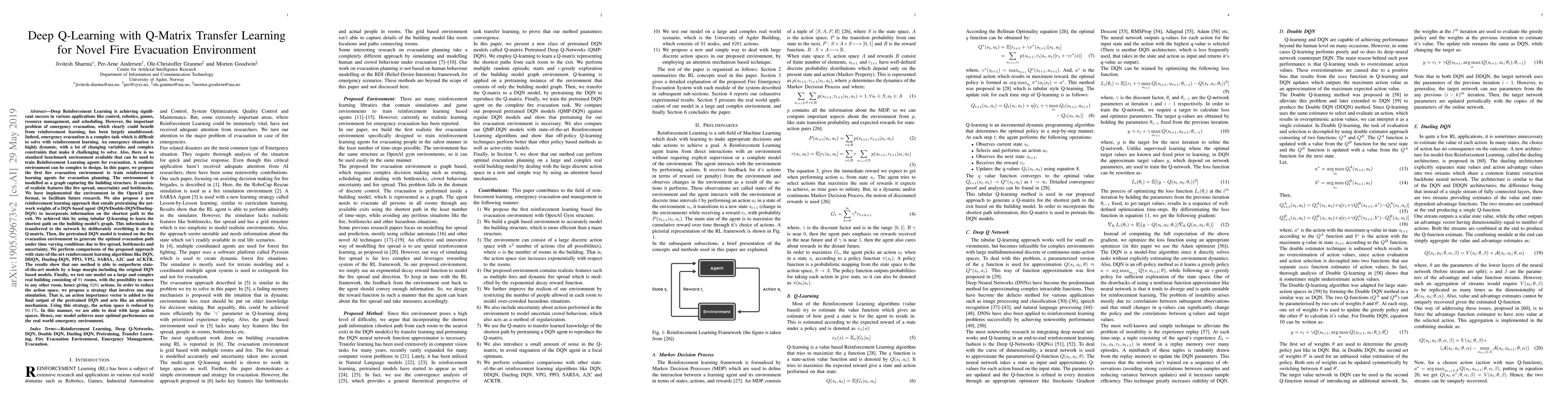 This paper introduces a novel fire evacuation environment for training reinforcement learning agents, employing deep Q-learning with Q-matrix transfer learning to pretrain DQN agents for optimal evacuation paths. The approach outperforms state-of-the-art methods and achieves near-optimal results in a large, complex real-world building simulation.