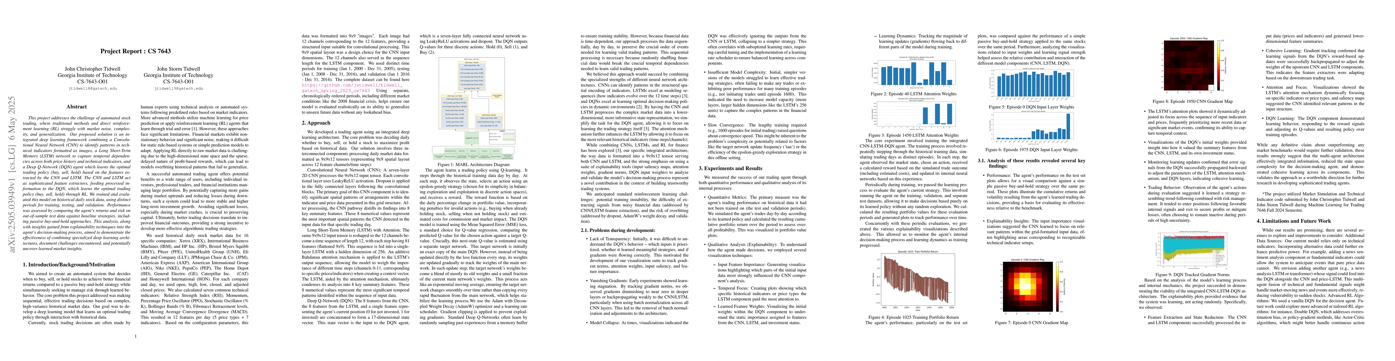 This project addresses the challenge of automated stock trading, where traditional methods and direct reinforcement learning (RL) struggle with market noise, complexity, and generalization. Our proposed solution is an integrated deep learning framework combining a Convolutional Neural Network (CNN) to identify patterns in technical indicators formatted as images, a Long Short-Term Memory (LSTM) network to capture temporal dependencies across both price history and technical indicators, and a Deep Q-Network (DQN) agent which learns the optimal trading policy (buy, sell, hold) based on the features extracted by the CNN and LSTM.