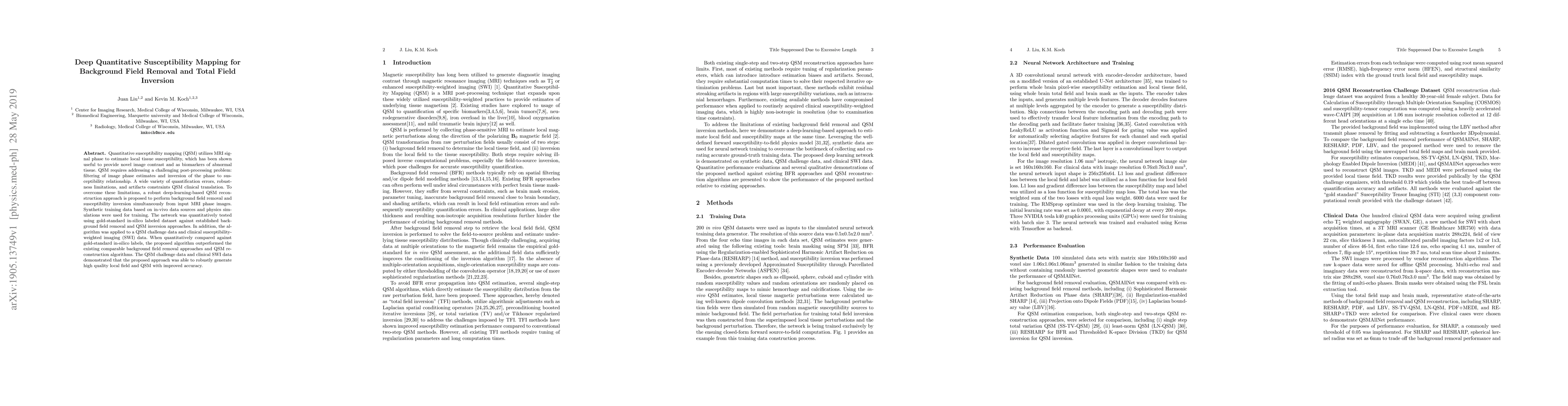 This paper proposes a deep-learning-based approach for quantitative susceptibility mapping (QSM) that simultaneously performs background field removal and susceptibility inversion from MRI phase images. The method demonstrated superior performance compared to existing techniques in both synthetic and clinical datasets.