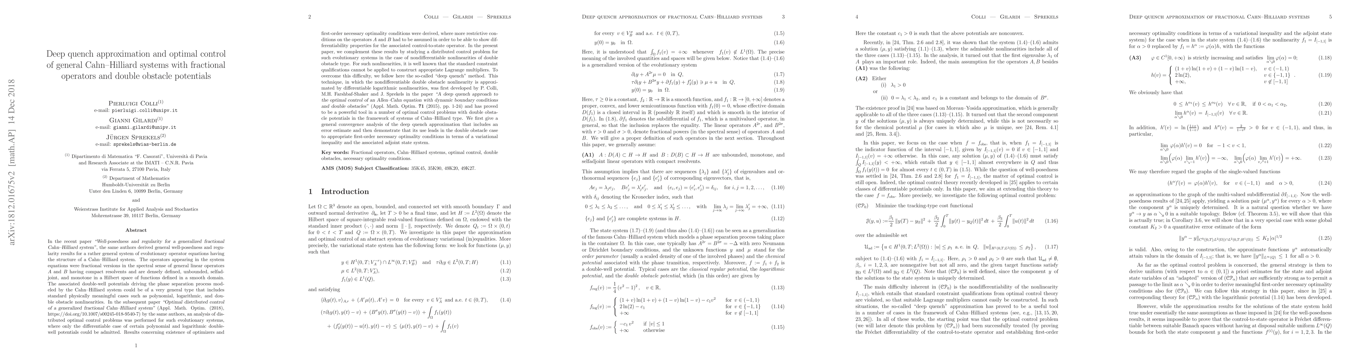 The paper arXiv:1804.11290 contains well-posedness and regularity results for a system of evolutionary operator equations having the structure of a Cahn-Hilliard system. The operators appearing in the system equations were fractional versions in the spectral sense of general linear operators A and B having compact resolvents and are densely defined, unbounded, selfadjoint, and monotone in a Hilbert space of functions defined in a smooth domain. The associated double-well potentials driving the phase separation process modeled by the Cahn-Hilliard system could be of a very general type that includes standard physically meaningful cases such as polynomial, logarithmic, and double obstacle nonlinearities. In the subsequent paper arXiv:1807.03218, an analysis of distributed optimal control problems was performed for such evolutionary systems, where only the differentiable case of certain polynomial and logarithmic double-well potentials could be admitted. Results concerning existence of optimizers and first-order necessary optimality conditions were derived. In the present paper, we complement these results by studying a distributed control problem for such evolutionary systems in the case of nondifferentiable nonlinearities of double obstacle type. For such nonlinearities, it is well known that the standard constraint qualifications cannot be applied to construct appropriate Lagrange multipliers. To overcome this difficulty, we follow here the so-called "deep quench" method. We first give a general convergence analysis of the deep quench approximation that includes an error estimate and then demonstrate that its use leads in the double obstacle case to appropriate first-order necessary optimality conditions in terms of a variational inequality and the associated adjoint state system.