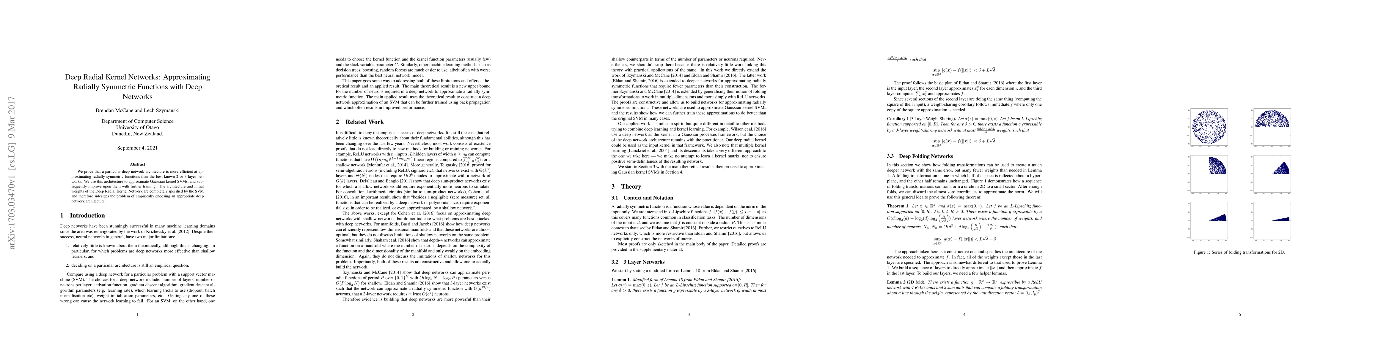 This paper introduces Deep Radial Kernel Networks, demonstrating their superior efficiency in approximating radially symmetric functions compared to traditional 2 or 3 layer networks. The architecture is specified by Gaussian kernel SVMs, eliminating the need for empirical network architecture selection.