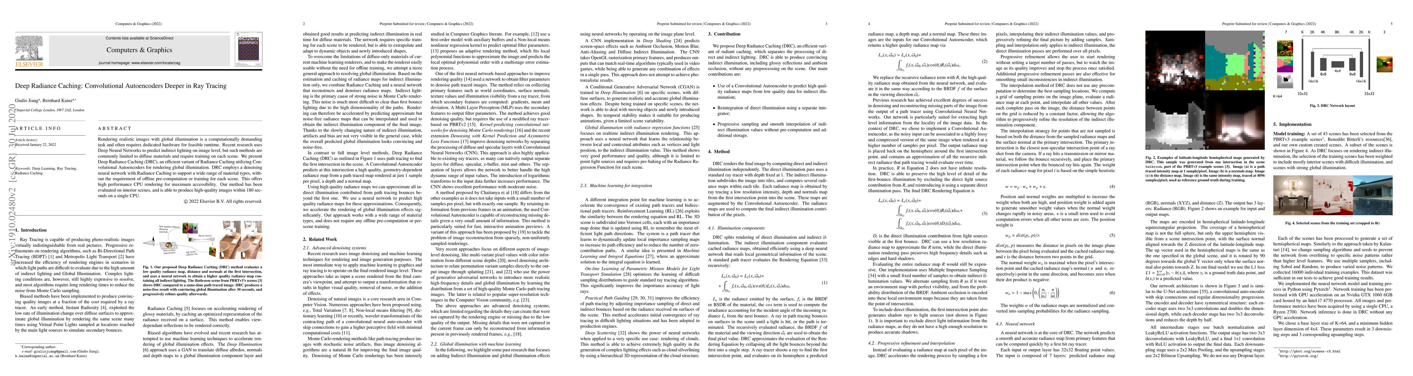 Deep Radiance Caching (DRC) leverages Convolutional Autoencoders to efficiently render global illumination without scene-specific training, enabling high-performance CPU rendering of realistic images. Evaluated on interior scenes, DRC produces high-quality results in approximately 180 seconds on a single CPU.