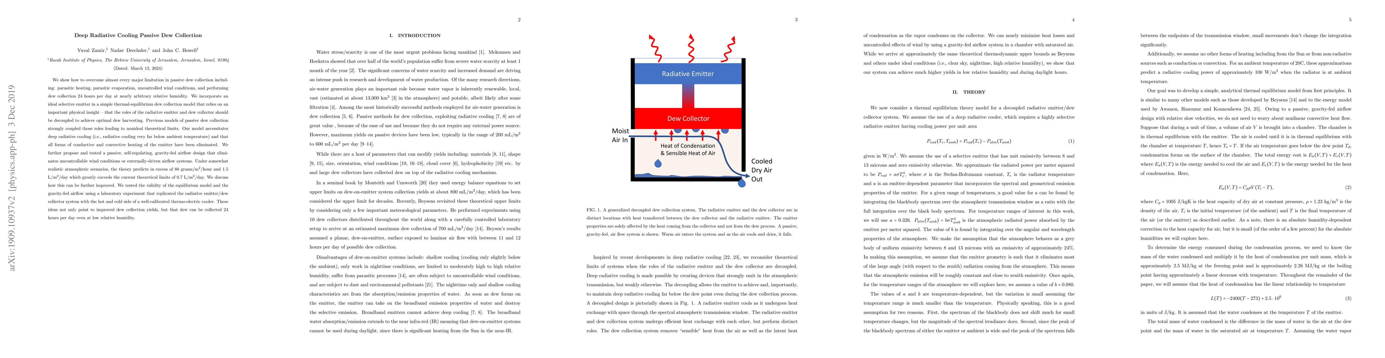 This paper proposes a novel passive dew collection system that overcomes major limitations through deep radiative cooling and decoupling the radiative emitter from the dew collector. The model predicts significantly higher dew yields, up to 1.5 L/m$^2$/day, and validates the system through a laboratory experiment using a thermoelectric cooler.