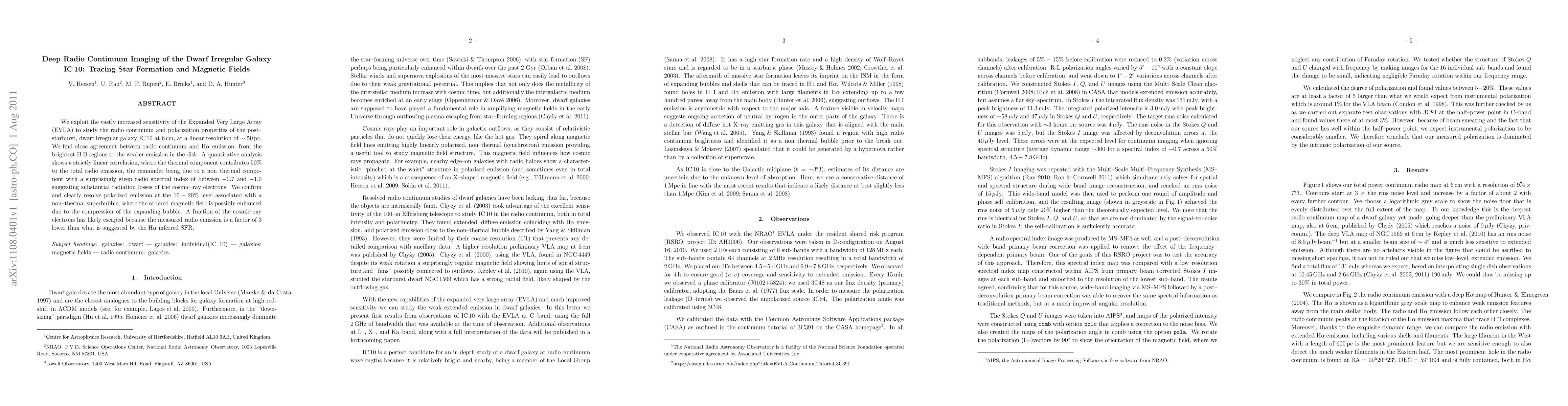 This paper uses the EVLA to study IC10's radio continuum and polarization, revealing a linear correlation between radio emission and Halpha, indicating substantial cosmic-ray electron losses. The study shows a non-thermal component with a steep spectral index and confirms polarized emission linked to a magnetic field enhancement in a non-thermal superbubble.