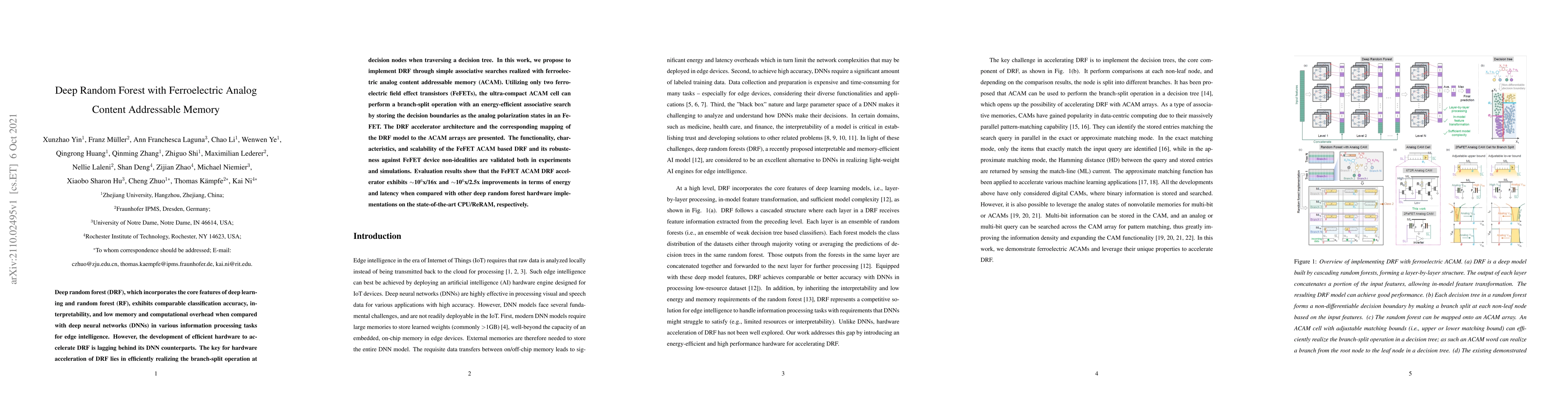 This paper proposes a deep random forest (DRF) accelerator using ferroelectric analog content addressable memory (ACAM) to enhance hardware efficiency. The FeFET ACAM-based DRF demonstrates significant improvements in energy and latency compared to existing CPU/ReRAM implementations, achieving up to 10^6x/16x and 10^6x/2.5x enhancements respectively.