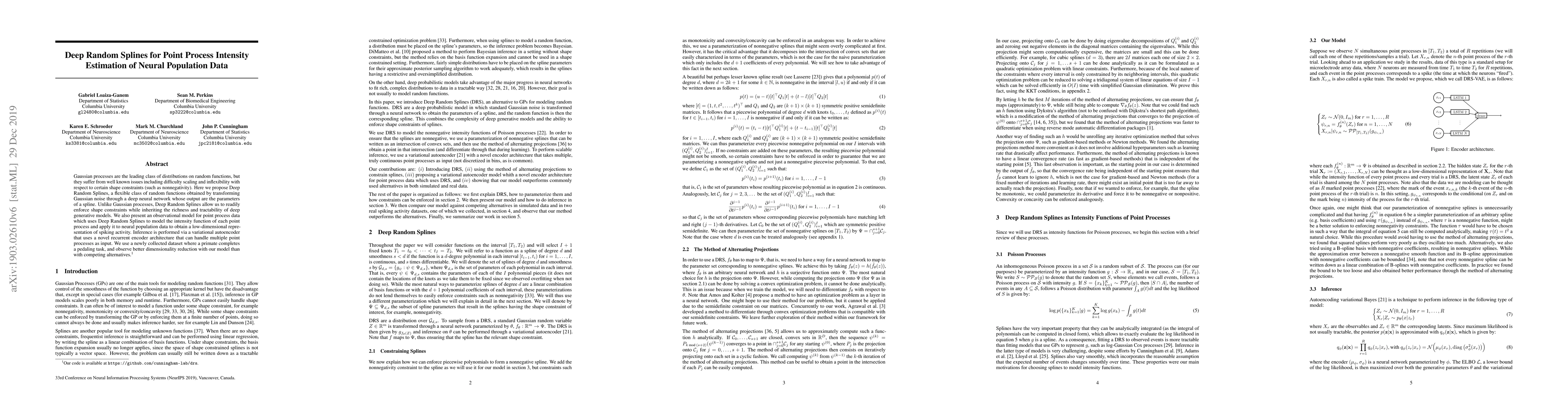 Researchers propose Deep Random Splines, a flexible model that uses neural networks to generate shape-constrained random functions for point process intensity estimation, achieving better dimensionality reduction in neural population data analysis.