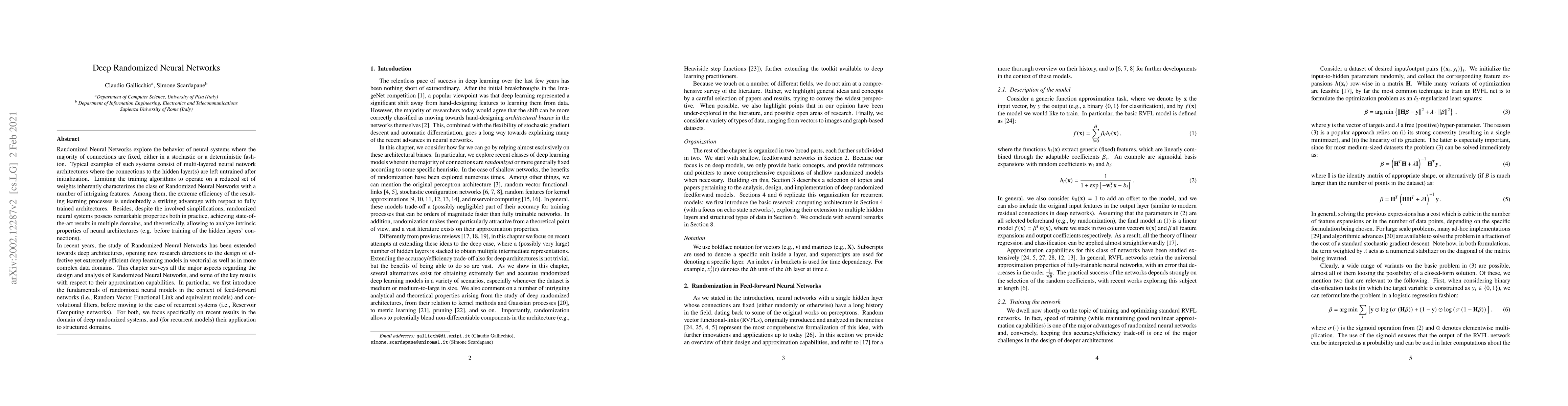 Randomized Neural Networks explore the behavior of neural systems where the majority of connections are fixed, either in a stochastic or a deterministic fashion. Typical examples of such systems consist of multi-layered neural network architectures where the connections to the hidden layer(s) are left untrained after initialization. Limiting the training algorithms to operate on a reduced set of weights inherently characterizes the class of Randomized Neural Networks with a number of intriguing features. Among them, the extreme efficiency of the resulting learning processes is undoubtedly a striking advantage with respect to fully trained architectures. Besides, despite the involved simplifications, randomized neural systems possess remarkable properties both in practice, achieving state-of-the-art results in multiple domains, and theoretically, allowing to analyze intrinsic properties of neural architectures (e.g. before training of the hidden layers' connections). In recent years, the study of Randomized Neural Networks has been extended towards deep architectures, opening new research directions to the design of effective yet extremely efficient deep learning models in vectorial as well as in more complex data domains. This chapter surveys all the major aspects regarding the design and analysis of Randomized Neural Networks, and some of the key results with respect to their approximation capabilities. In particular, we first introduce the fundamentals of randomized neural models in the context of feed-forward networks (i.e., Random Vector Functional Link and equivalent models) and convolutional filters, before moving to the case of recurrent systems (i.e., Reservoir Computing networks). For both, we focus specifically on recent results in the domain of deep randomized systems, and (for recurrent models) their application to structured domains.