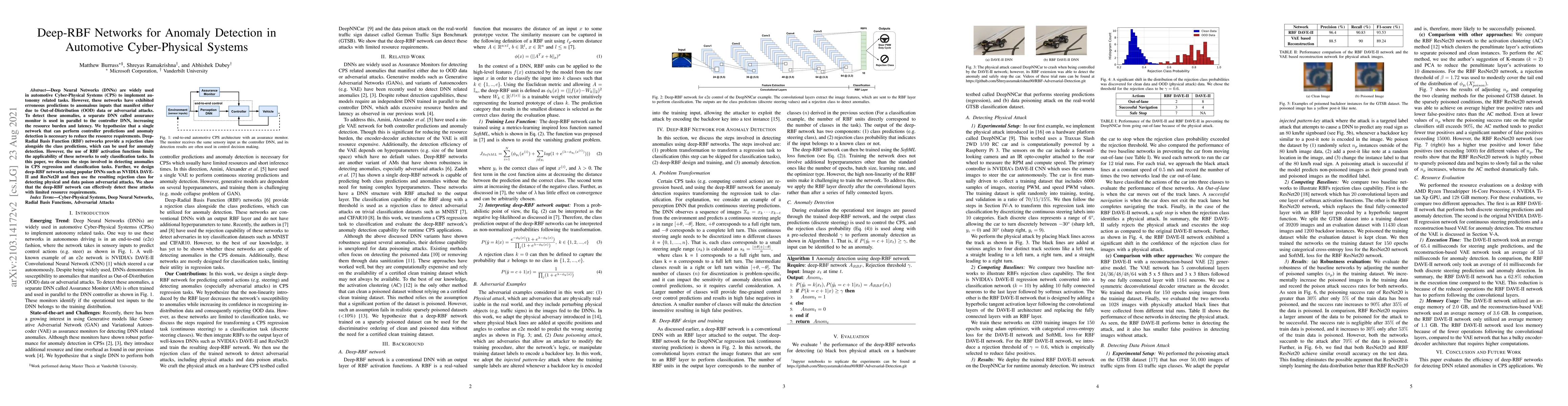 Deep Neural Networks (DNNs) are popularly used for implementing autonomy related tasks in automotive Cyber-Physical Systems (CPSs). However, these networks have been shown to make erroneous predictions to anomalous inputs, which manifests either due to Out-of-Distribution (OOD) data or adversarial attacks. To detect these anomalies, a separate DNN called assurance monitor is often trained and used in parallel to the controller DNN, increasing the resource burden and latency. We hypothesize that a single network that can perform controller predictions and anomaly detection is necessary to reduce the resource requirements. Deep-Radial Basis Function (RBF) networks provide a rejection class alongside the class predictions, which can be utilized for detecting anomalies at runtime. However, the use of RBF activation functions limits the applicability of these networks to only classification tasks. In this paper, we show how the deep-RBF network can be used for detecting anomalies in CPS regression tasks such as continuous steering predictions. Further, we design deep-RBF networks using popular DNNs such as NVIDIA DAVE-II, and ResNet20, and then use the resulting rejection class for detecting adversarial attacks such as a physical attack and data poison attack. Finally, we evaluate these attacks and the trained deep-RBF networks using a hardware CPS testbed called DeepNNCar and a real-world German Traffic Sign Benchmark (GTSB) dataset. Our results show that the deep-RBF networks can robustly detect these attacks in a short time without additional resource requirements.