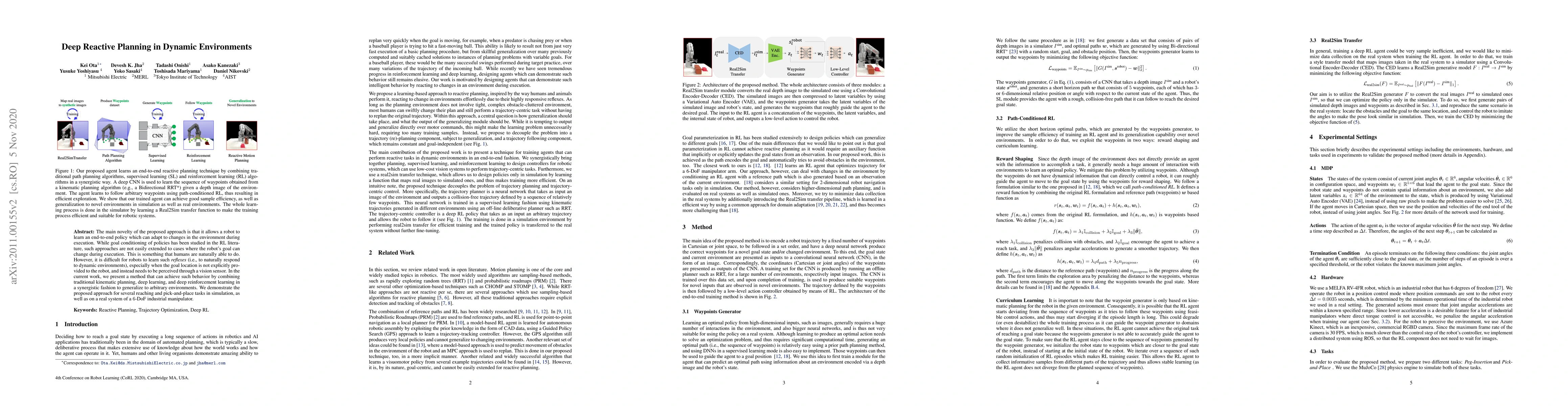 The main novelty of the proposed approach is that it allows a robot to learn an end-to-end policy which can adapt to changes in the environment during execution. While goal conditioning of policies has been studied in the RL literature, such approaches are not easily extended to cases where the robot's goal can change during execution. This is something that humans are naturally able to do. However, it is difficult for robots to learn such reflexes (i.e., to naturally respond to dynamic environments), especially when the goal location is not explicitly provided to the robot, and instead needs to be perceived through a vision sensor. In the current work, we present a method that can achieve such behavior by combining traditional kinematic planning, deep learning, and deep reinforcement learning in a synergistic fashion to generalize to arbitrary environments. We demonstrate the proposed approach for several reaching and pick-and-place tasks in simulation, as well as on a real system of a 6-DoF industrial manipulator. A video describing our work could be found \url{https://youtu.be/hE-Ew59GRPQ}.