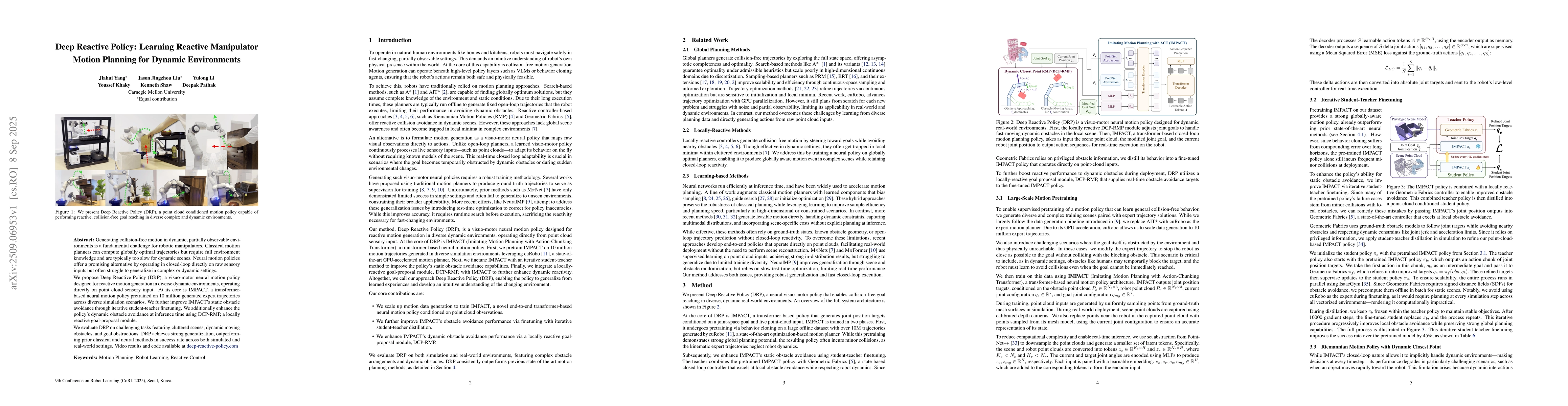 Generating collision-free motion in dynamic, partially observable environments is a fundamental challenge for robotic manipulators. Classical motion planners can compute globally optimal trajectories but require full environment knowledge and are typically too slow for dynamic scenes. Neural motion policies offer a promising alternative by operating in closed-loop directly on raw sensory inputs but often struggle to generalize in complex or dynamic settings. We propose Deep Reactive Policy (DRP), a visuo-motor neural motion policy designed for reactive motion generation in diverse dynamic environments, operating directly on point cloud sensory input. At its core is IMPACT, a transformer-based neural motion policy pretrained on 10 million generated expert trajectories across diverse simulation scenarios. We further improve IMPACT's static obstacle avoidance through iterative student-teacher finetuning. We additionally enhance the policy's dynamic obstacle avoidance at inference time using DCP-RMP, a locally reactive goal-proposal module. We evaluate DRP on challenging tasks featuring cluttered scenes, dynamic moving obstacles, and goal obstructions. DRP achieves strong generalization, outperforming prior classical and neural methods in success rate across both simulated and real-world settings. Video results and code available at https://deep-reactive-policy.com