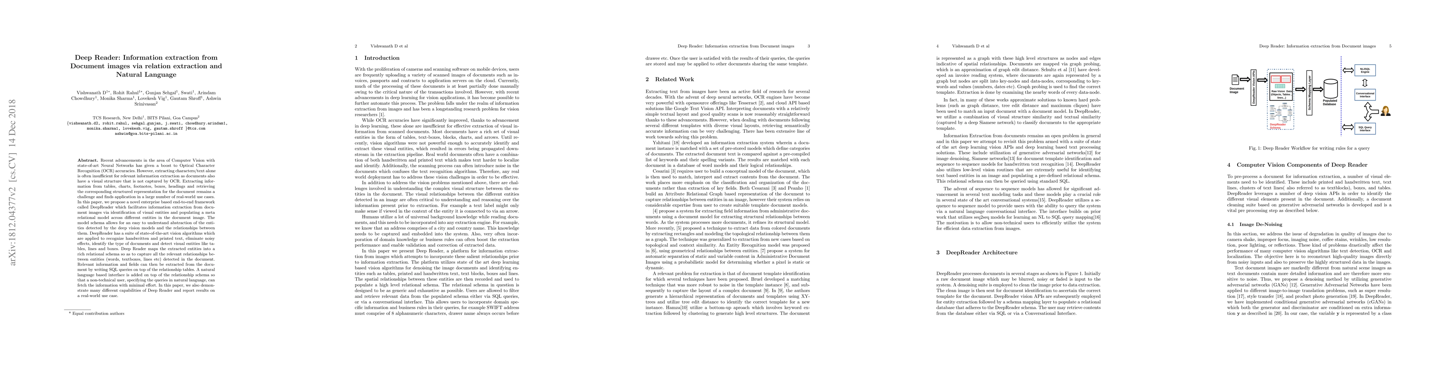 DeepReader is an end-to-end framework for extracting information from document images by identifying visual entities and mapping them into a relational schema, enabling structured data retrieval via SQL queries and natural language interfaces. The system leverages advanced vision algorithms to recognize text and detect visual elements, facilitating comprehensive information extraction beyond traditional OCR.