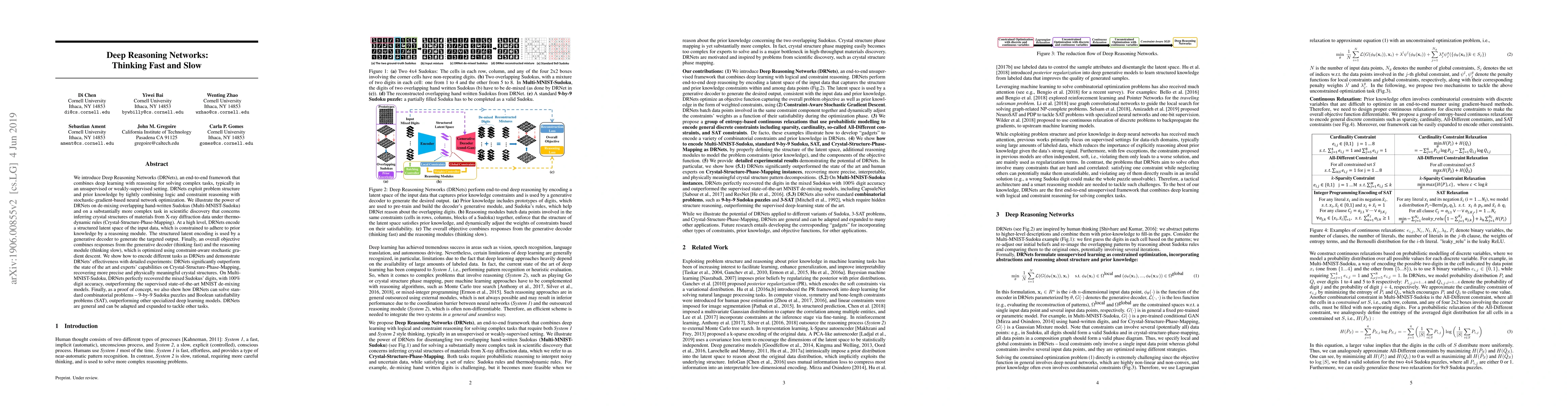 Deep Reasoning Networks (DRNets) combine deep learning with reasoning to solve complex tasks, achieving superior performance on tasks like de-mixing overlapping Sudokus and inferring crystal structures from X-ray data. DRNets integrate fast generative decoding with slow reasoning, optimizing an overall objective that leverages both approaches.