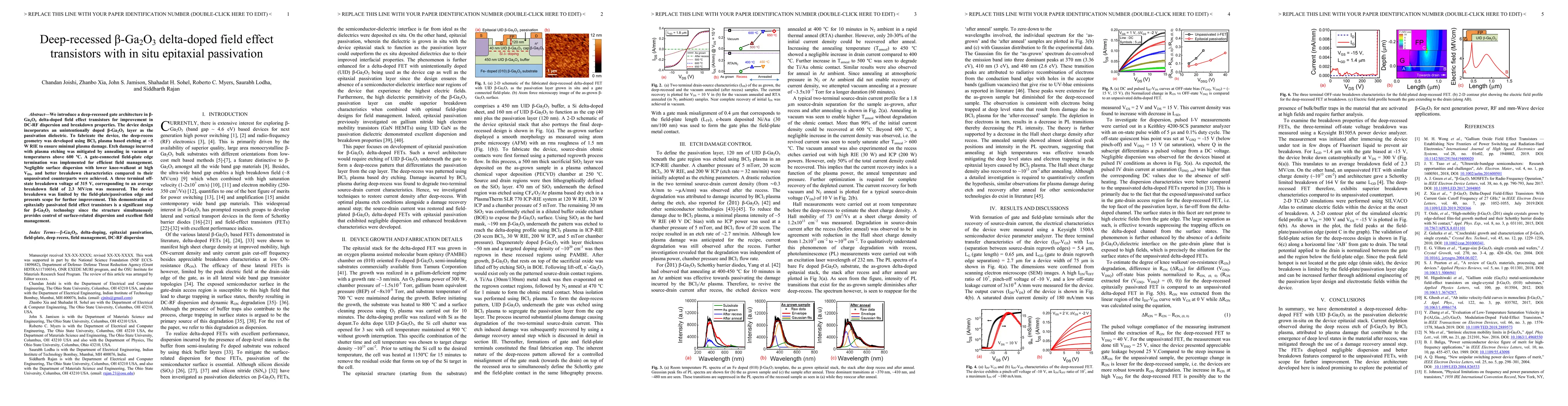 We introduce a deep-recessed gate architecture in $\beta$-Ga$_2$O$_3$ delta-doped field effect transistors for improvement in DC-RF dispersion and breakdown properties. The device design incorporates an unintentionally doped $\beta$-Ga$_2$O$_3$ layer as the passivation dielectric. To fabricate the device, the deep-recess geometry was developed using BCl$_3$ plasma based etching at ~5 W RIE to ensure minimal plasma damage. Etch damage incurred with plasma etching was mitigated by annealing in vacuum at temperatures above 600 $\deg$C. A gate-connected field-plate edge termination was implemented for efficient field management. Negligible surface dispersion with lower knee-walkout at high V$_\mathrm{DS}$, and better breakdown characteristics compared to their unpassivated counterparts were achieved. A three terminal off-state breakdown voltage of 315 V, corresponding to an average breakdown field of 2.3 MV/cm was measured. The device breakdown was limited by the field-plate/passivation edge and presents scope for further improvement. This demonstration of epitaxially passivated field effect transistors is a significant step for $\beta$-Ga$_2$O$_3$ technology since the structure simultaneously provides control of surface-related dispersion and excellent field management.