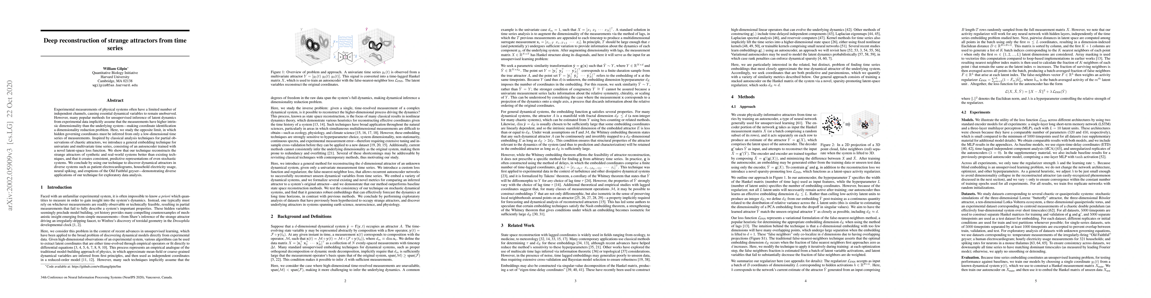 Experimental measurements of physical systems often have a limited number of independent channels, causing essential dynamical variables to remain unobserved. However, many popular methods for unsupervised inference of latent dynamics from experimental data implicitly assume that the measurements have higher intrinsic dimensionality than the underlying system---making coordinate identification a dimensionality reduction problem. Here, we study the opposite limit, in which hidden governing coordinates must be inferred from only a low-dimensional time series of measurements. Inspired by classical analysis techniques for partial observations of chaotic attractors, we introduce a general embedding technique for univariate and multivariate time series, consisting of an autoencoder trained with a novel latent-space loss function. We show that our technique reconstructs the strange attractors of synthetic and real-world systems better than existing techniques, and that it creates consistent, predictive representations of even stochastic systems. We conclude by using our technique to discover dynamical attractors in diverse systems such as patient electrocardiograms, household electricity usage, neural spiking, and eruptions of the Old Faithful geyser---demonstrating diverse applications of our technique for exploratory data analysis.