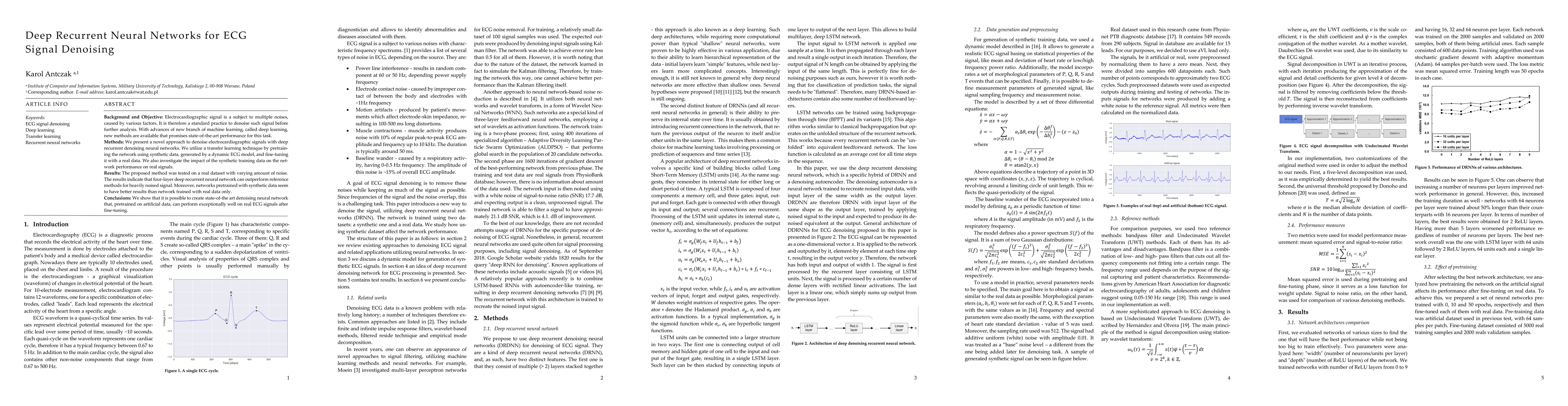 This paper proposes a novel approach using deep recurrent neural networks for denoising electrocardiographic (ECG) signals, employing transfer learning with synthetic data to enhance performance on real noisy signals. The results demonstrate that a four-layer deep recurrent neural network, pretrained on synthetic data and fine-tuned with real data, outperforms existing methods, especially for heavily noised signals.