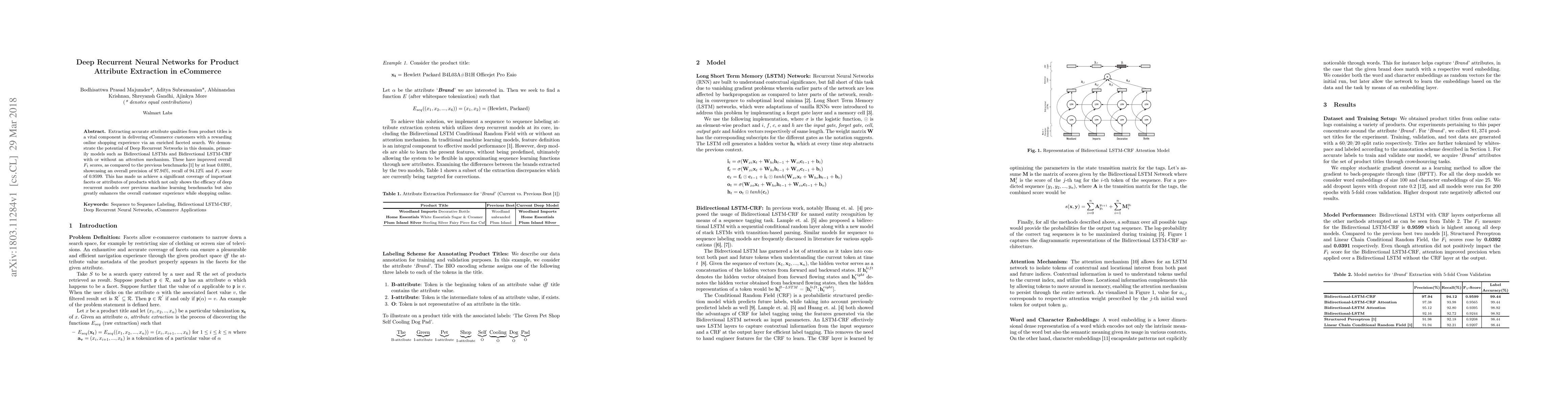 This paper explores the use of Deep Recurrent Neural Networks, particularly Bidirectional LSTMs and Bidirectional LSTM-CRF, to extract product attributes from eCommerce titles, achieving an F1 score improvement of 0.0391 over previous benchmarks. The models demonstrate high precision and recall, significantly enhancing faceted search and customer experience.
