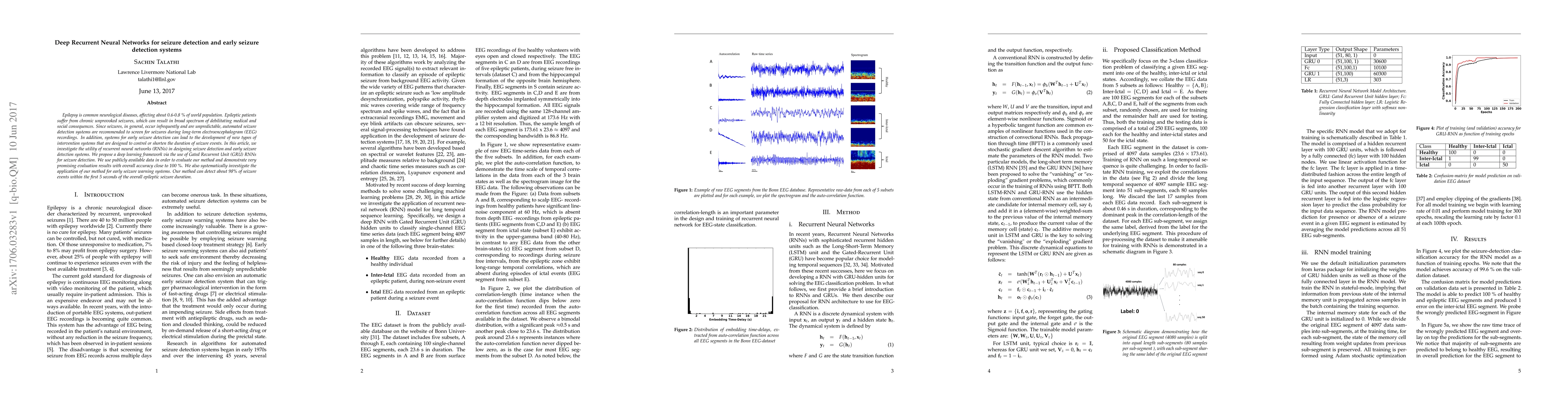 Epilepsy is common neurological diseases, affecting about 0.6-0.8 % of world population. Epileptic patients suffer from chronic unprovoked seizures, which can result in broad spectrum of debilitating medical and social consequences. Since seizures, in general, occur infrequently and are unpredictable, automated seizure detection systems are recommended to screen for seizures during long-term electroencephalogram (EEG) recordings. In addition, systems for early seizure detection can lead to the development of new types of intervention systems that are designed to control or shorten the duration of seizure events. In this article, we investigate the utility of recurrent neural networks (RNNs) in designing seizure detection and early seizure detection systems. We propose a deep learning framework via the use of Gated Recurrent Unit (GRU) RNNs for seizure detection. We use publicly available data in order to evaluate our method and demonstrate very promising evaluation results with overall accuracy close to 100 %. We also systematically investigate the application of our method for early seizure warning systems. Our method can detect about 98% of seizure events within the first 5 seconds of the overall epileptic seizure duration.
