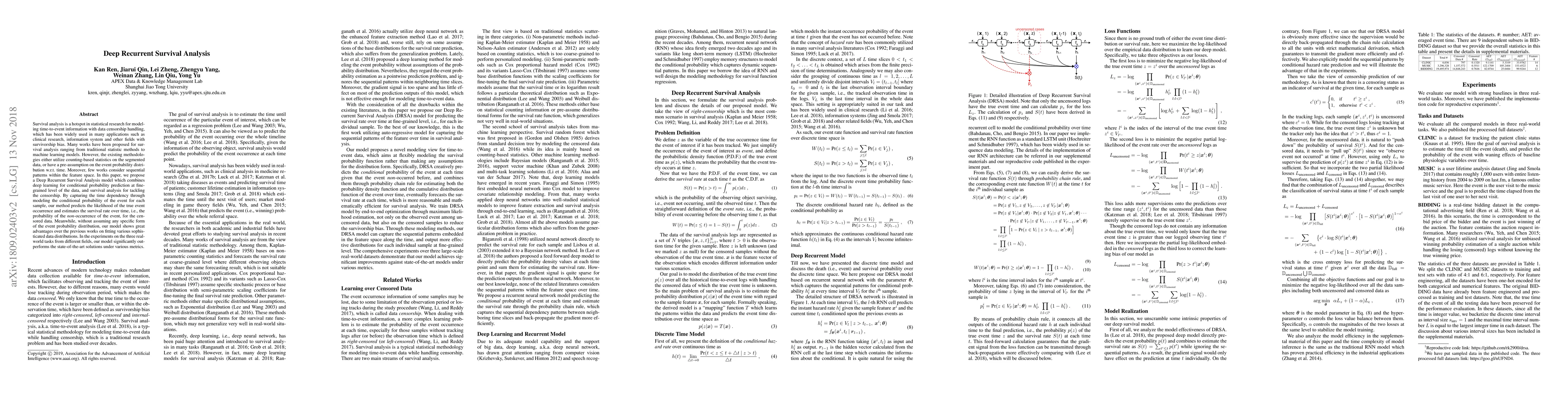 This paper introduces a Deep Recurrent Survival Analysis model that leverages deep learning to predict conditional probabilities and survival rates, addressing censorship in survival data without assuming specific event probability distributions. The proposed model outperforms existing methods on real-world datasets across various fields.