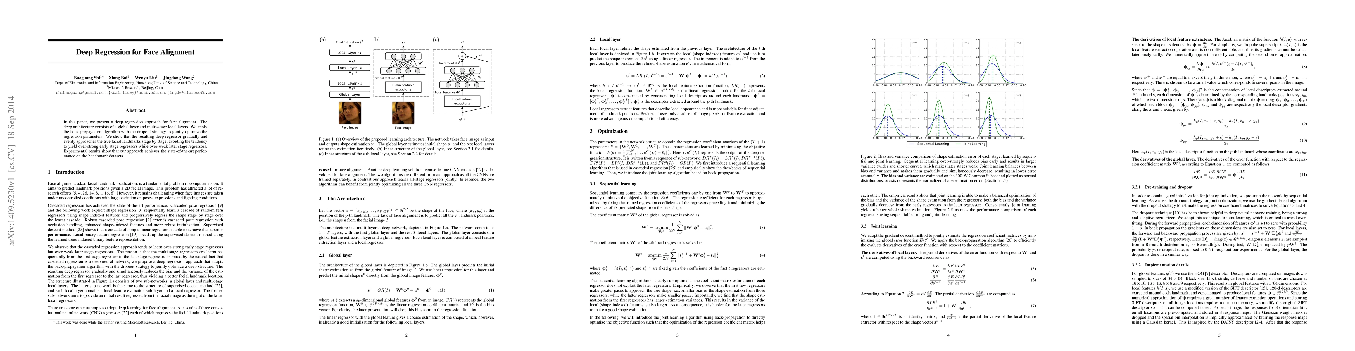 The paper presents a deep regression approach for face alignment using a deep architecture consisting of a global layer and multi-stage local layers. The back-propagation algorithm with the dropout strategy is applied to jointly optimize the regression parameters.