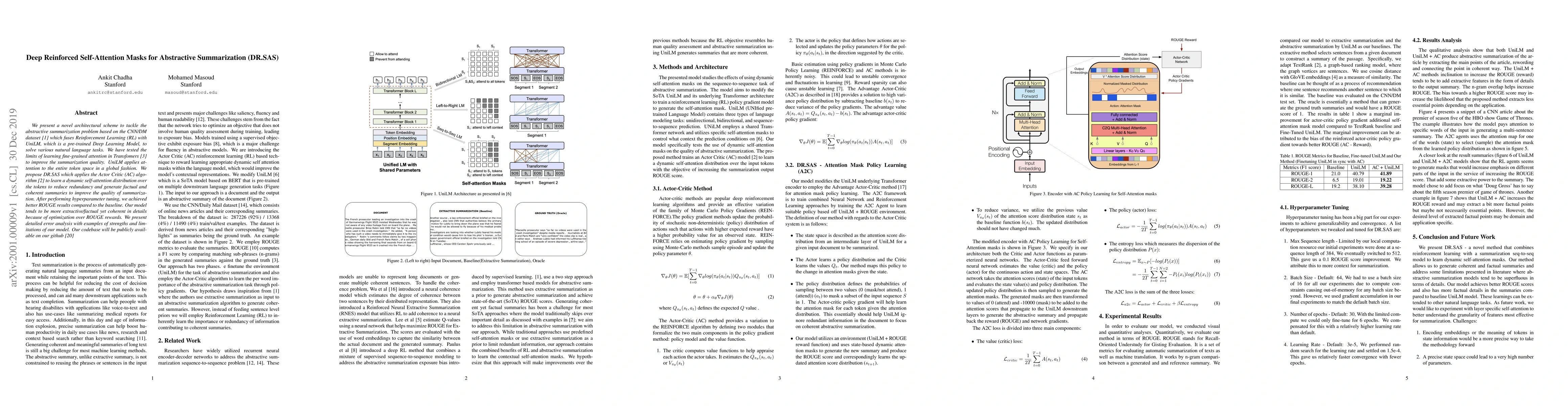 We present a novel architectural scheme to tackle the abstractive summarization problem based on the CNN/DMdataset which fuses Reinforcement Learning (RL) withUniLM, which is a pre-trained Deep Learning Model, to solve various natural language tasks. We have tested the limits of learning fine-grained attention in Transformers to improve the summarization quality. UniLM applies attention to the entire token space in a global fashion. We propose DR.SAS which applies the Actor-Critic (AC) algorithm to learn a dynamic self-attention distribution over the tokens to reduce redundancy and generate factual and coherent summaries to improve the quality of summarization. After performing hyperparameter tuning, we achievedbetter ROUGE results compared to the baseline. Our model tends to be more extractive/factual yet coherent in detail because of optimization over ROUGE rewards. We present detailed error analysis with examples of the strengths and limitations of our model. Our codebase will be publicly available on our GitHub.