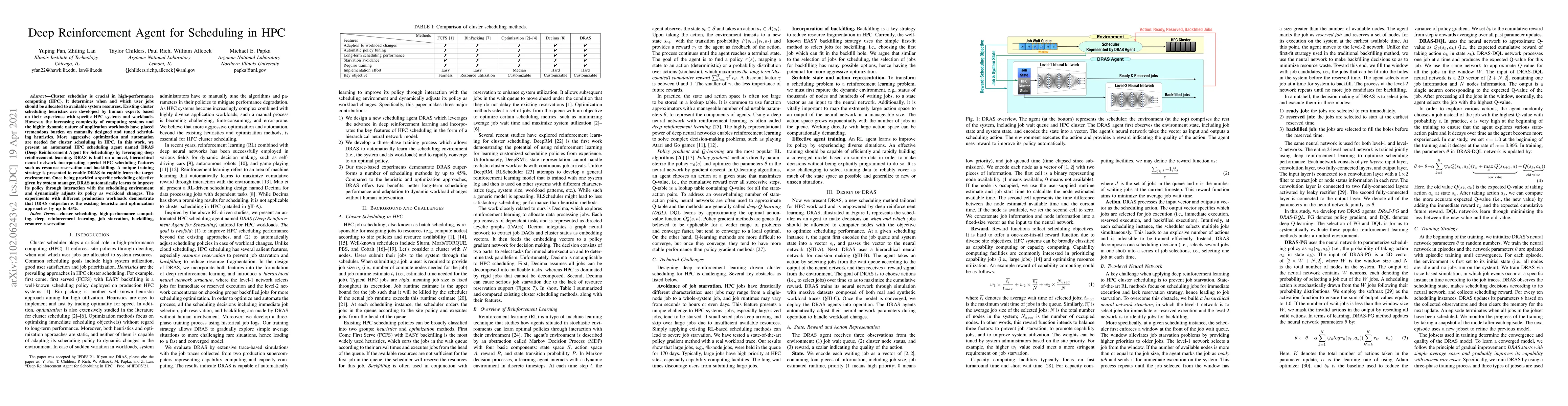 This paper proposes DRAS, a deep reinforcement learning agent for automating high-performance computing (HPC) cluster scheduling. DRAS incorporates hierarchical neural networks and a unique training strategy to optimize resource allocation dynamically, outperforming existing heuristic methods by up to 45%.
