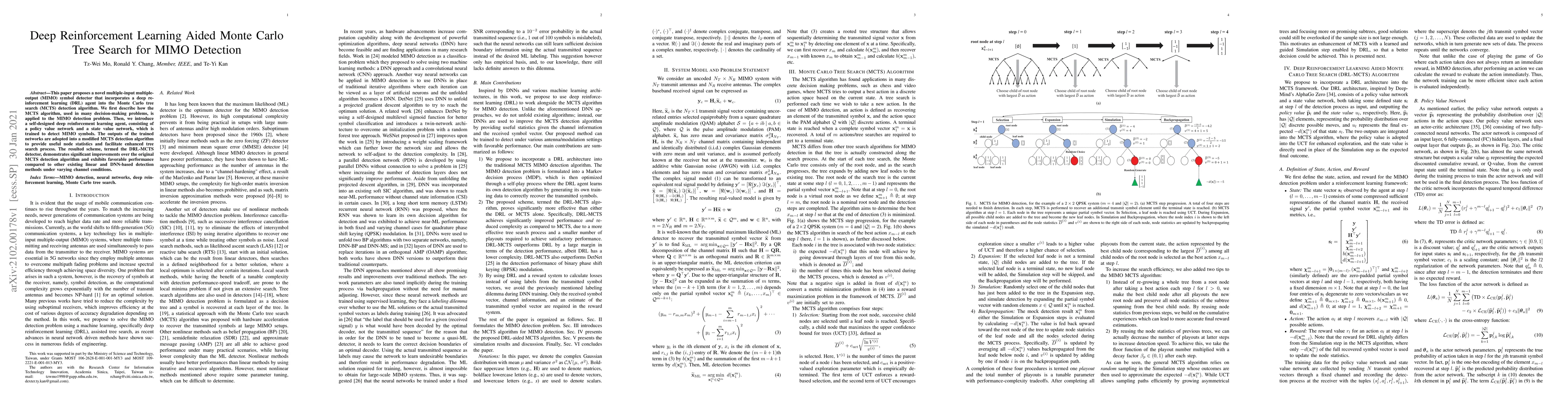 This paper introduces a novel MIMO symbol detection method combining deep reinforcement learning with Monte Carlo tree search, showing significant performance improvements over traditional MCTS and other detection techniques. The DRL-MCTS detector leverages a trained DRL agent to enhance the tree search process, achieving superior results under various channel conditions.